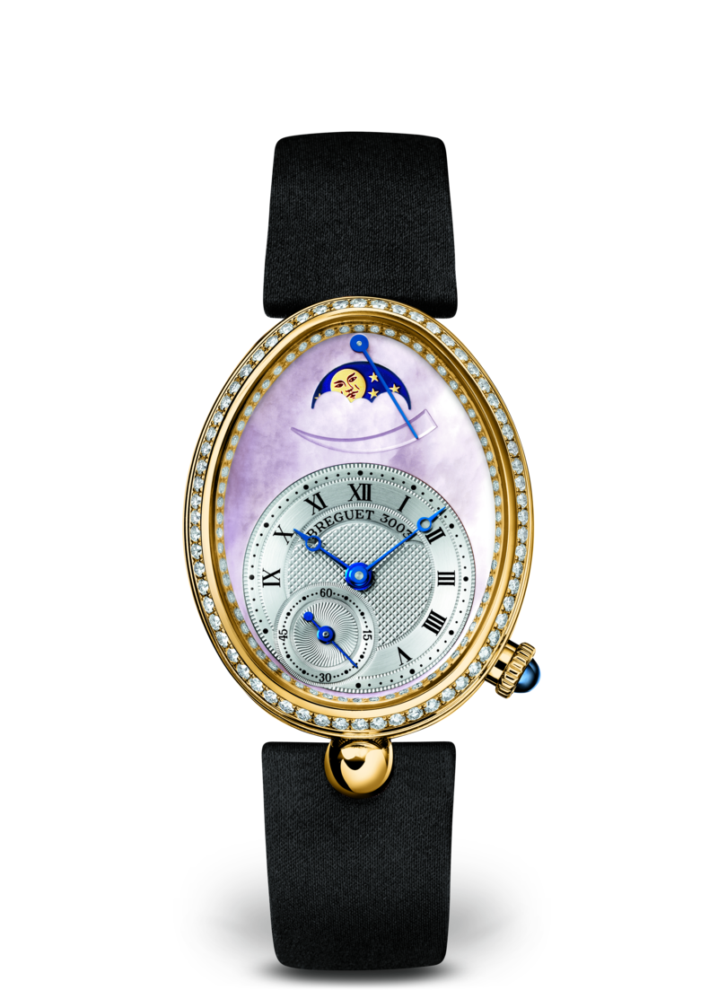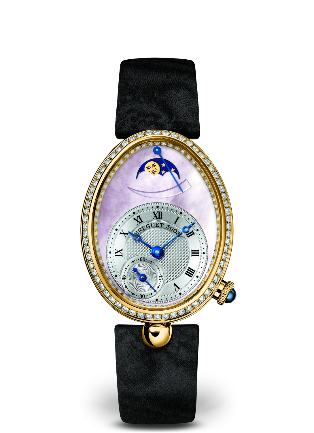 Cette montre ravive les attributs principaux de la première montre conçue pour être portée au poignet que sont la phase de lune et l’indicateur de réserve de marche.