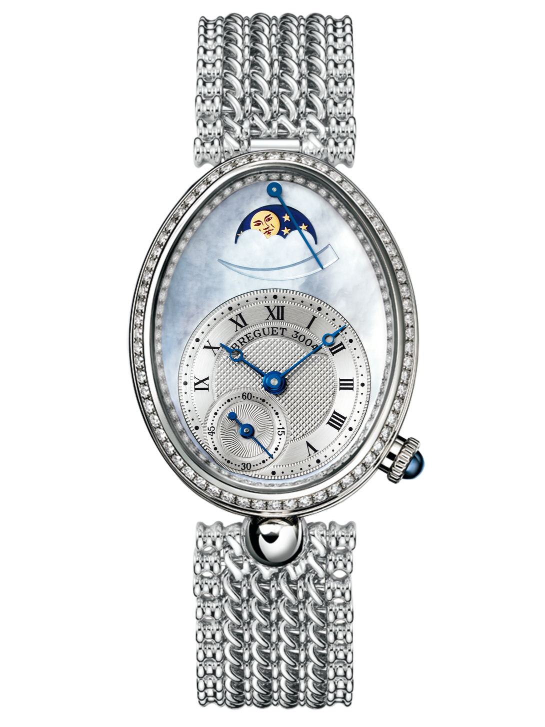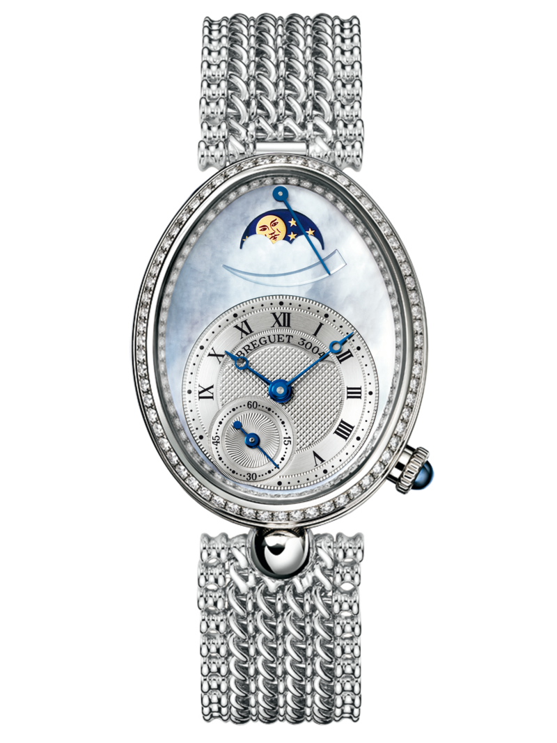 Cette montre ravive les attributs principaux de la première montre conçue pour être portée au poignet que sont la phase de lune et l’indicateur de réserve de marche.