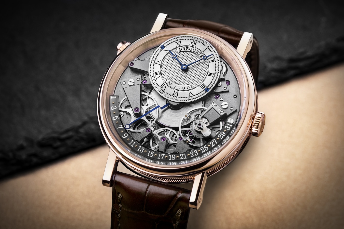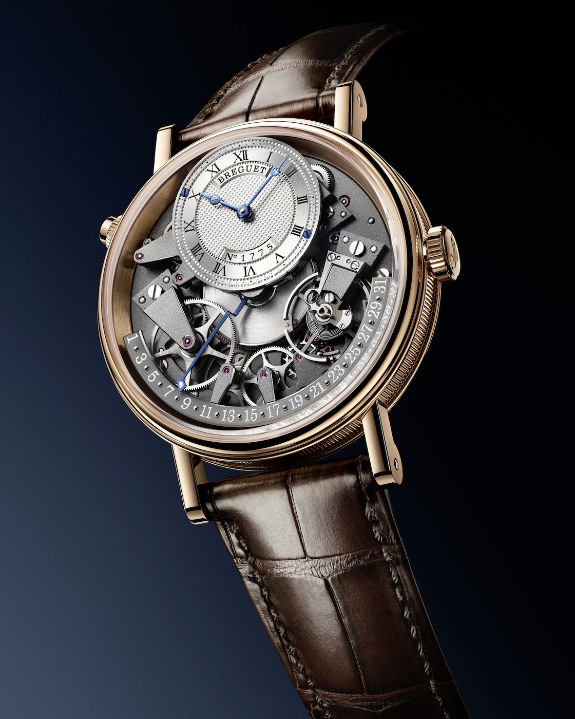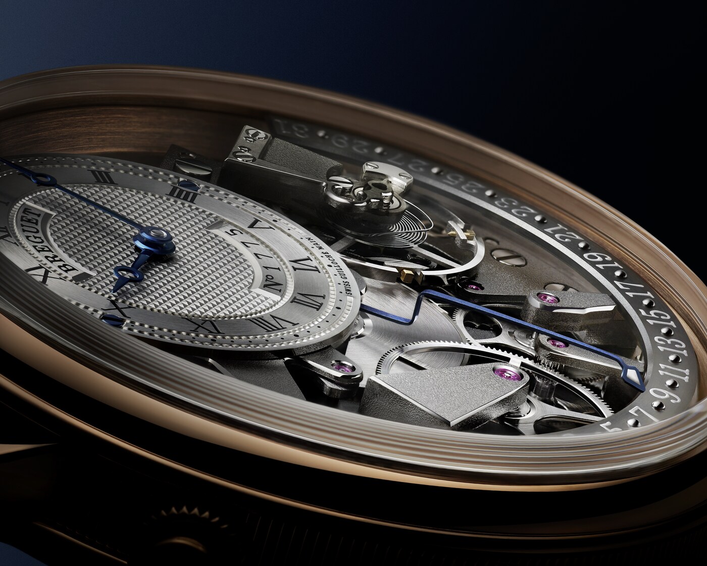 Aux côtés des traditionnelles aiguilles Breguet qui ornent le cadran excentré et indiquent les heures et les minutes, figure une autre aiguille qui se distingue par son architecture étonnante. Courbée dans le plan vertical, elle présente de multiples niveaux lui permettant de survoler les composants du mouvement jusqu’à rejoindre le secteur placé entre 3 h et 9 h. Sa fonction rétrograde lui permet de revenir à 1, une fois arrivée à la fin du mois. Ce n’est autre qu’A.-L. Breguet qui fut un des premiers à mettre au point la date rétrograde dont il gratifiera quelques-unes de ses célèbres créations.
