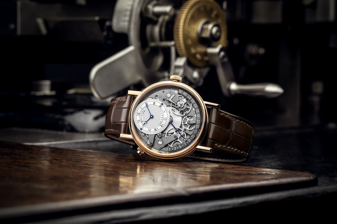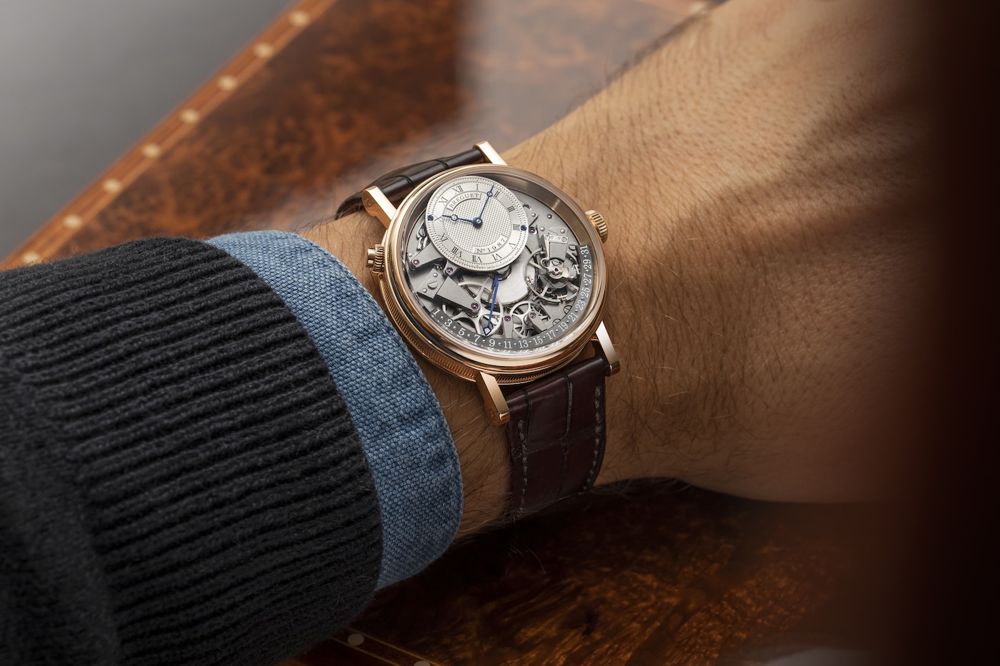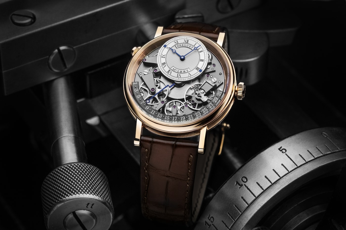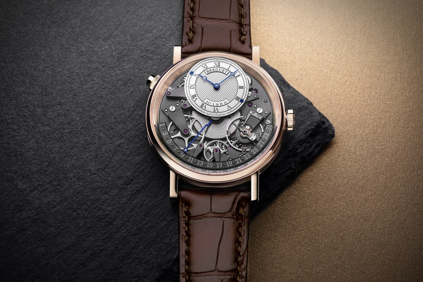 Aux côtés des traditionnelles aiguilles Breguet qui ornent le cadran excentré et indiquent les heures et les minutes, figure une autre aiguille qui se distingue par son architecture étonnante. Courbée dans le plan vertical, elle présente de multiples niveaux lui permettant de survoler les composants du mouvement jusqu’à rejoindre le secteur placé entre 3 h et 9 h. Sa fonction rétrograde lui permet de revenir à 1, une fois arrivée à la fin du mois. Ce n’est autre qu’A.-L. Breguet qui fut un des premiers à mettre au point la date rétrograde dont il gratifiera quelques-unes de ses célèbres créations.