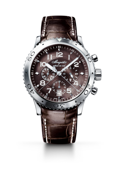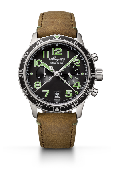 Son cadran noir a été modernisé tout en restant fidèle à l’identité Type 20. Les chiffres arabes ainsi que le triangle présent sur la lunette sont luminescents et arborent une teinte vert menthe, tout comme l’ensemble des aiguilles. Le compteur de 30 minutes, situé à 3 h, est désormais plus imposant que celui de 60 secondes, affiché à 9 h, tandis qu’un guichet de date vient s’ajouter à 4 h 30.