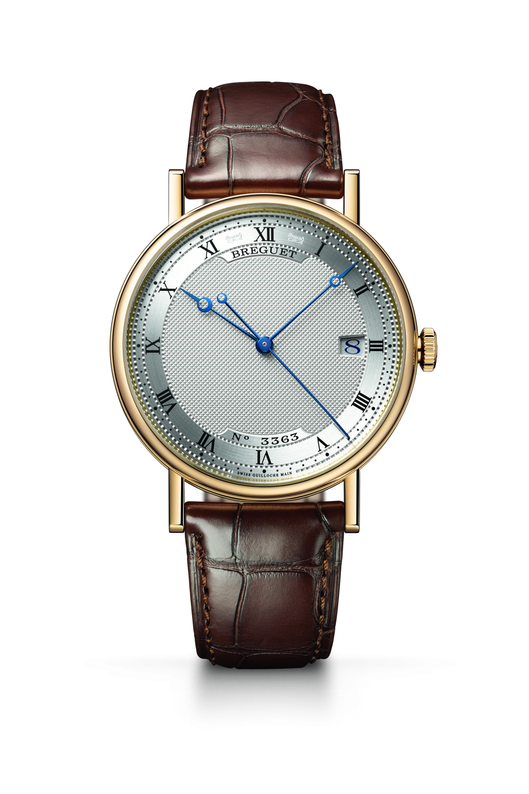 L’indicazione della data a ore 3 completa la visualizzazione dell’ora su un quadrante guilloché o smaltato.