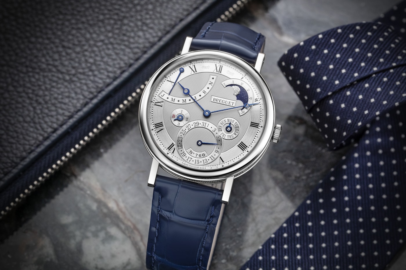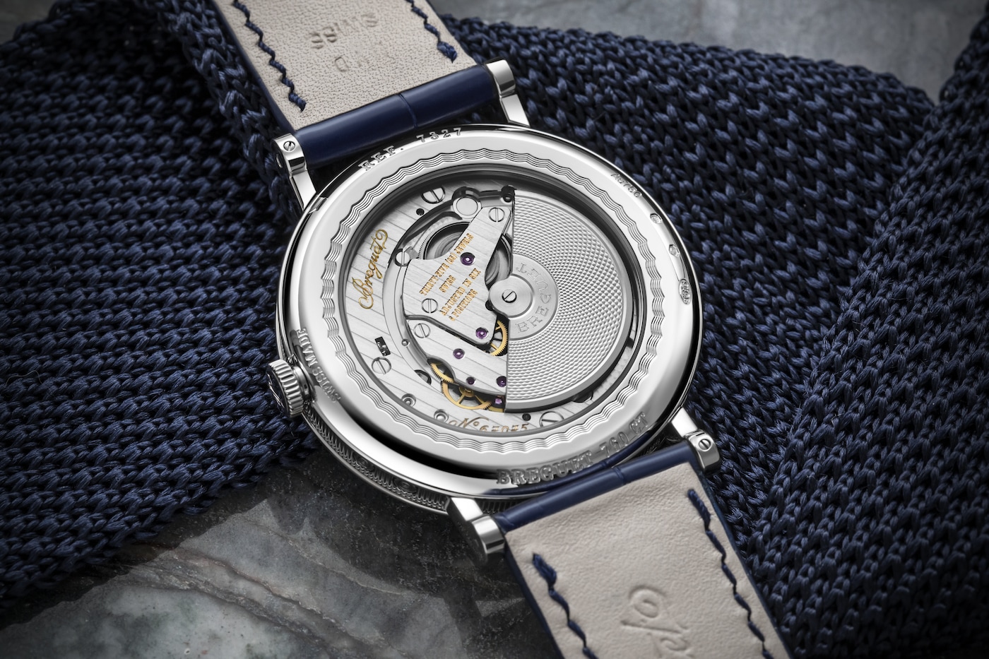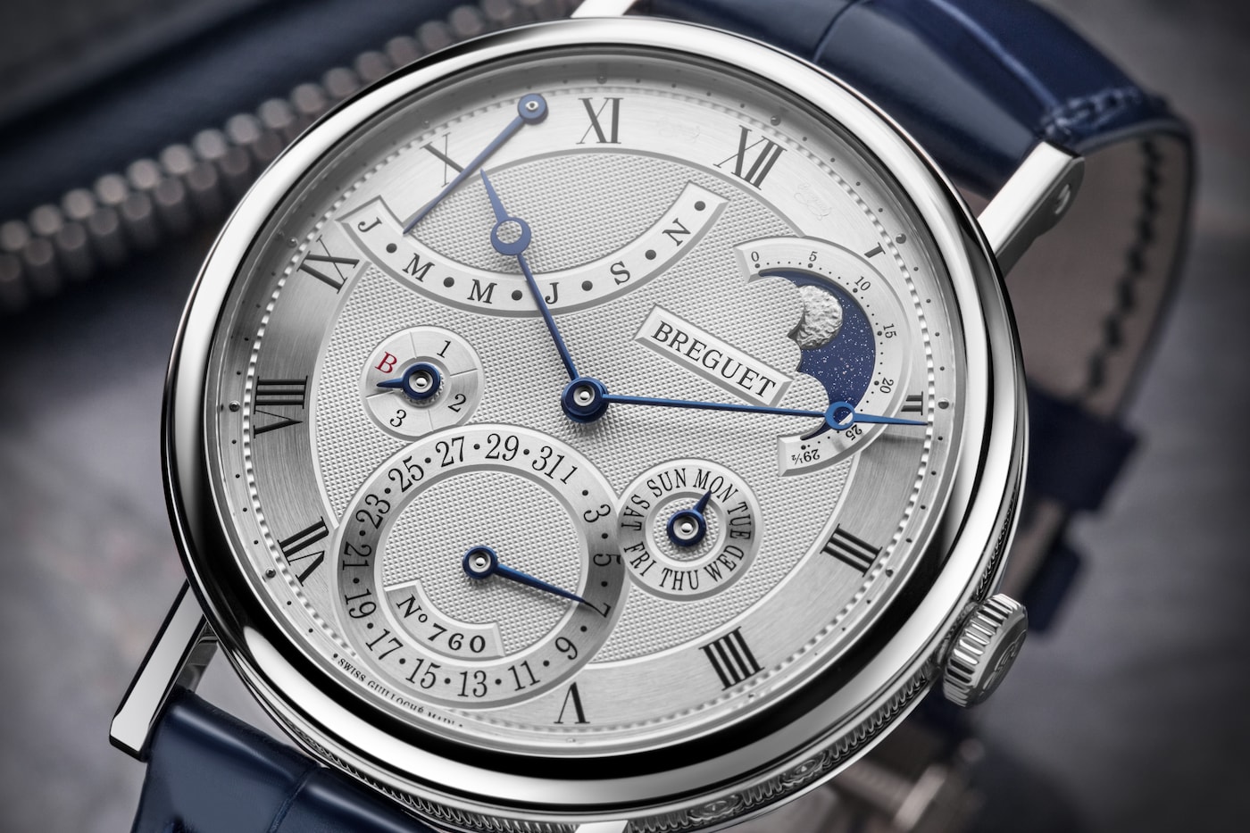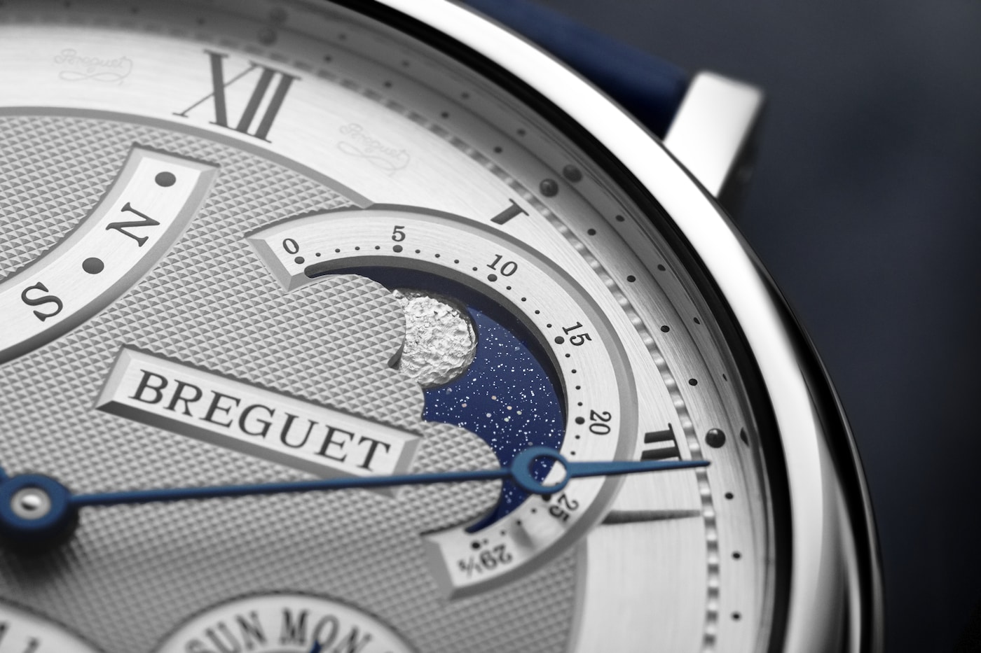 Questa complicazione consente di visualizzare la data esatta tenendo conto della lunghezza variabile dei mesi e del ciclo degli anni bisestili. Tale prodezza tecnica è possibile in virtù della “memoria” meccanica di 4 anni, ossia 1461 giorni, del movimento. Eppure una complessità del genere non ha impedito a Breguet di realizzare anche un movimento tra i più sottili mai prodotti dalla Maison, caratterizzato dallo spessore di soli 4,5 mm. Il Classique 7327 presenta inoltre una lavorazione guilloché con motivo “Clous de Paris” di straordinaria eleganza. Le fasi lunari sono martellate a mano: il cielo scintilla grazie all’utilizzo di una laccatura blu satinata.