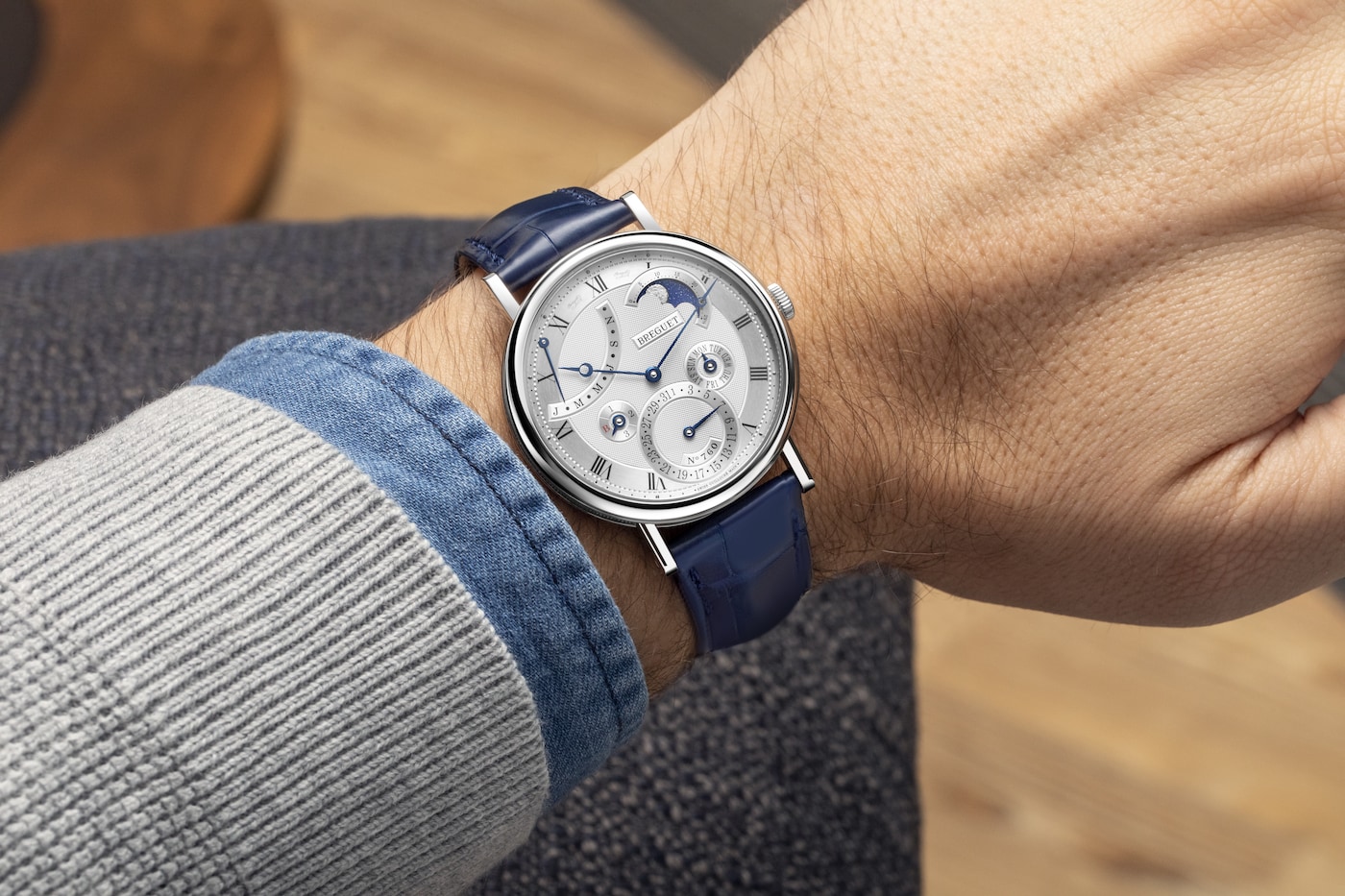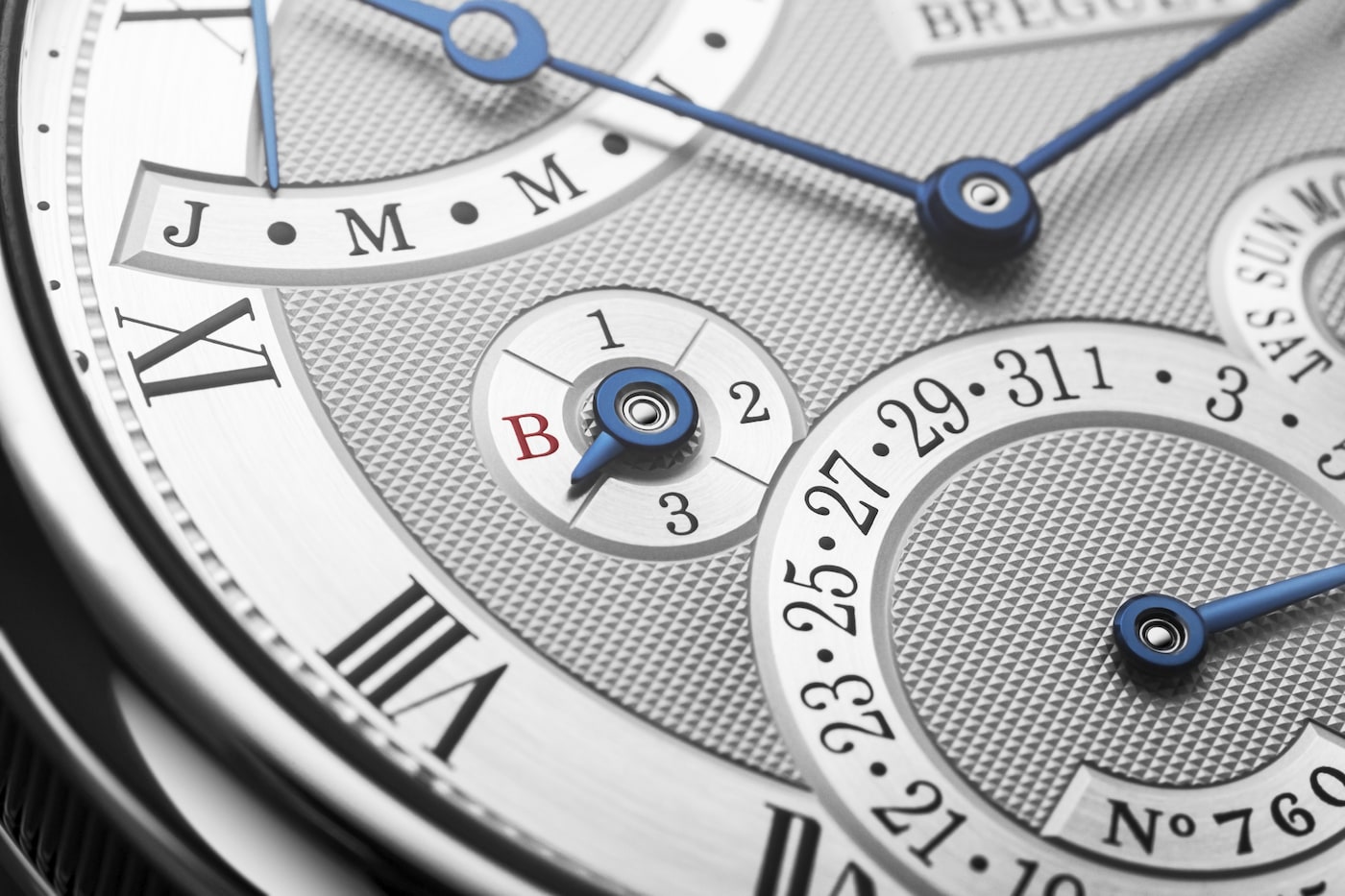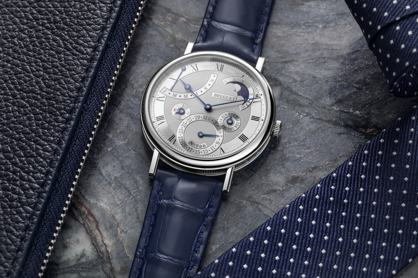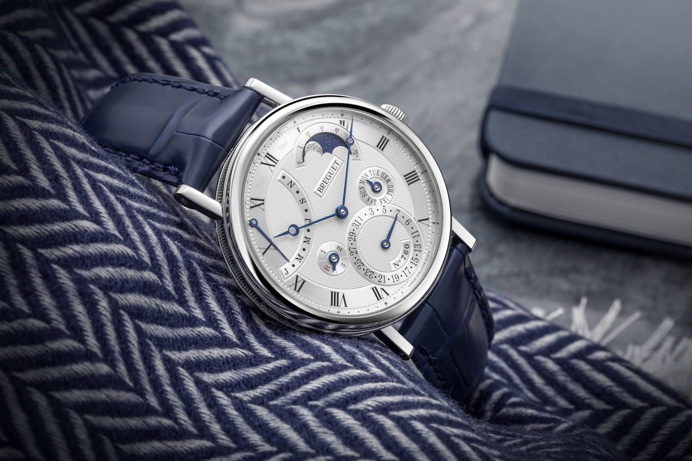 Questa complicazione consente di visualizzare la data esatta tenendo conto della lunghezza variabile dei mesi e del ciclo degli anni bisestili. Tale prodezza tecnica è possibile in virtù della “memoria” meccanica di 4 anni, ossia 1461 giorni, del movimento. Eppure una complessità del genere non ha impedito a Breguet di realizzare anche un movimento tra i più sottili mai prodotti dalla Maison, caratterizzato dallo spessore di soli 4,5 mm. Il Classique 7327 presenta inoltre una lavorazione guilloché con motivo “Clous de Paris” di straordinaria eleganza. Le fasi lunari sono martellate a mano: il cielo scintilla grazie all’utilizzo di una laccatura blu satinata.