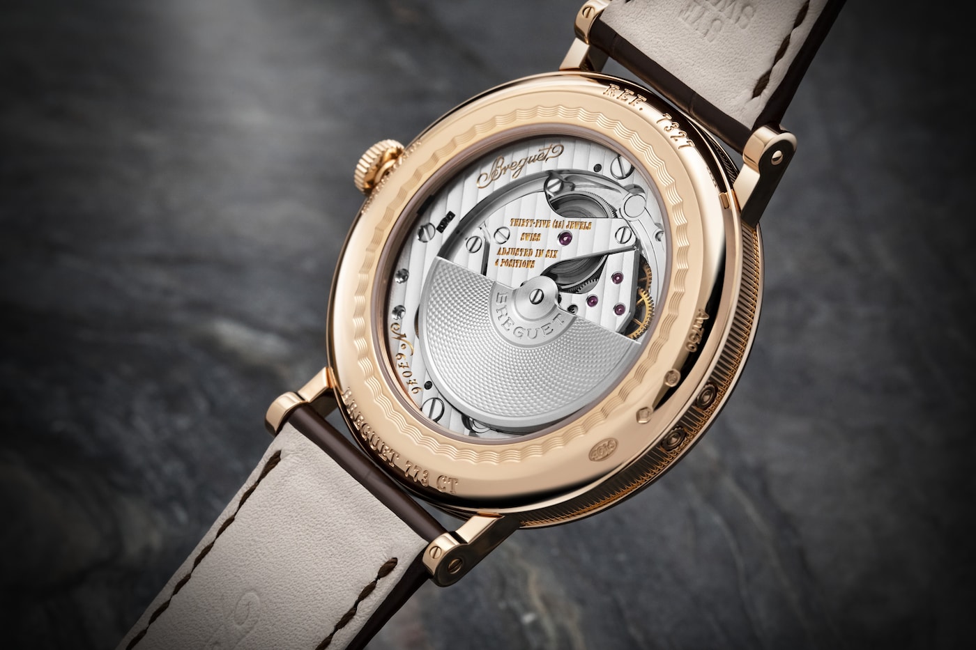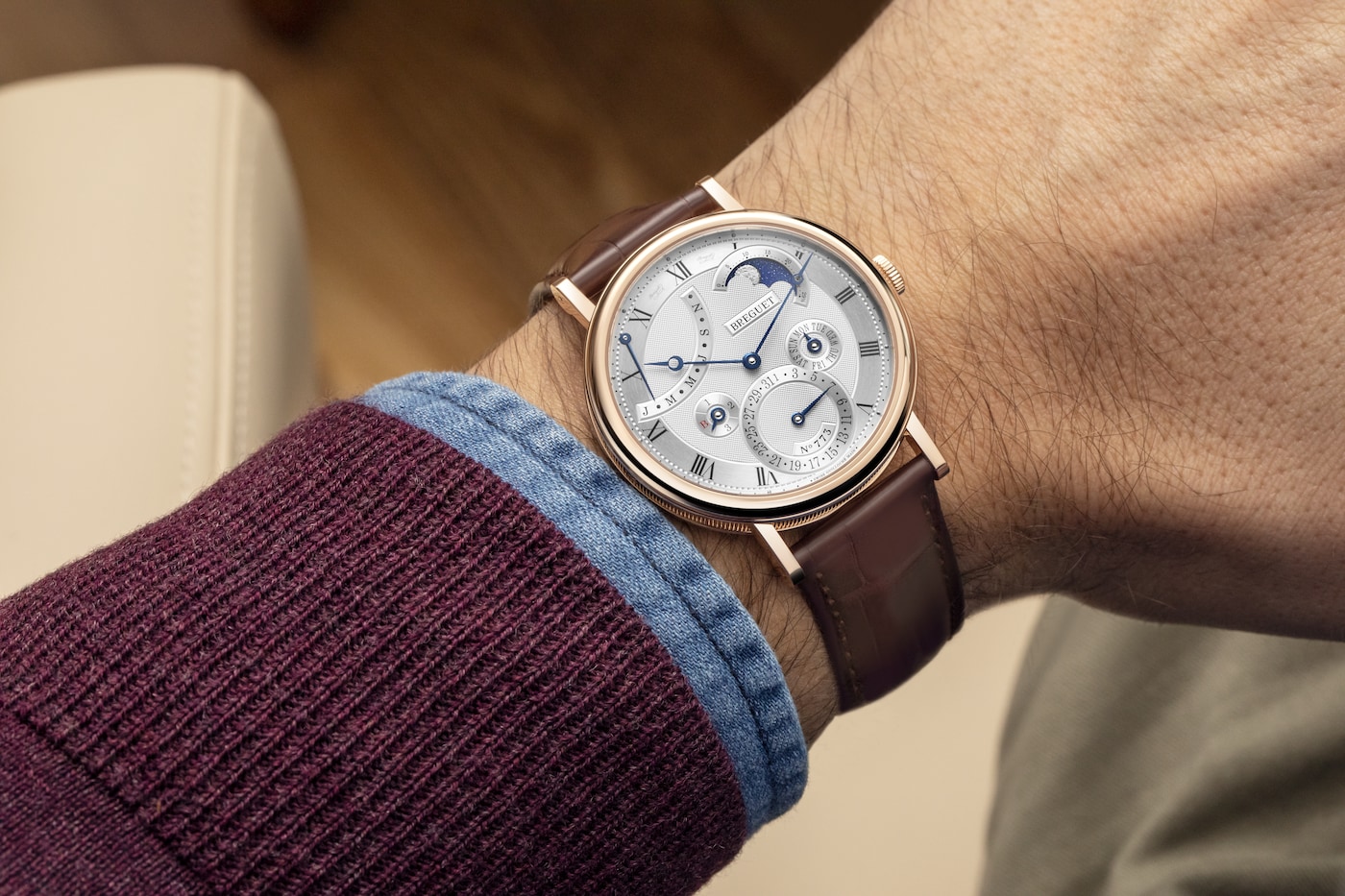 Questa complicazione consente di visualizzare la data esatta tenendo conto della lunghezza variabile dei mesi e del ciclo degli anni bisestili. Tale prodezza tecnica è possibile in virtù della “memoria” meccanica di 4 anni, ossia 1461 giorni, del movimento. Eppure una complessità del genere non ha impedito a Breguet di realizzare anche un movimento tra i più sottili mai prodotti dalla Maison, caratterizzato dallo spessore di soli 4,5 mm. Il Classique 7327 presenta inoltre una lavorazione guilloché con motivo “Clous de Paris” di straordinaria eleganza. Le fasi lunari sono martellate a mano: il cielo scintilla grazie all’utilizzo di una laccatura blu satinata.