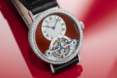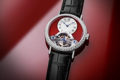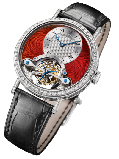 Madreperla e diamanti circondano il tourbillon posto all’interno di un’ampia apertura curva e ovale. La versione in oro rosa mostra l’ora su un giro delle ore in madreperla naturale bianca con al centro dei diamanti incastonati a neve. Sul modello in oro bianco, il quadrante in madreperla perlata e verniciata blu notte è costellato di stelle che richiamano un cielo notturno. Il ponte del tourbillon rievoca una stella cadente composta da diamanti con incastonatura a neve.