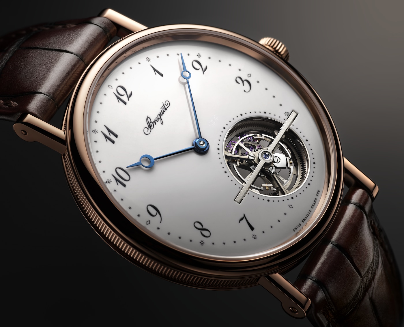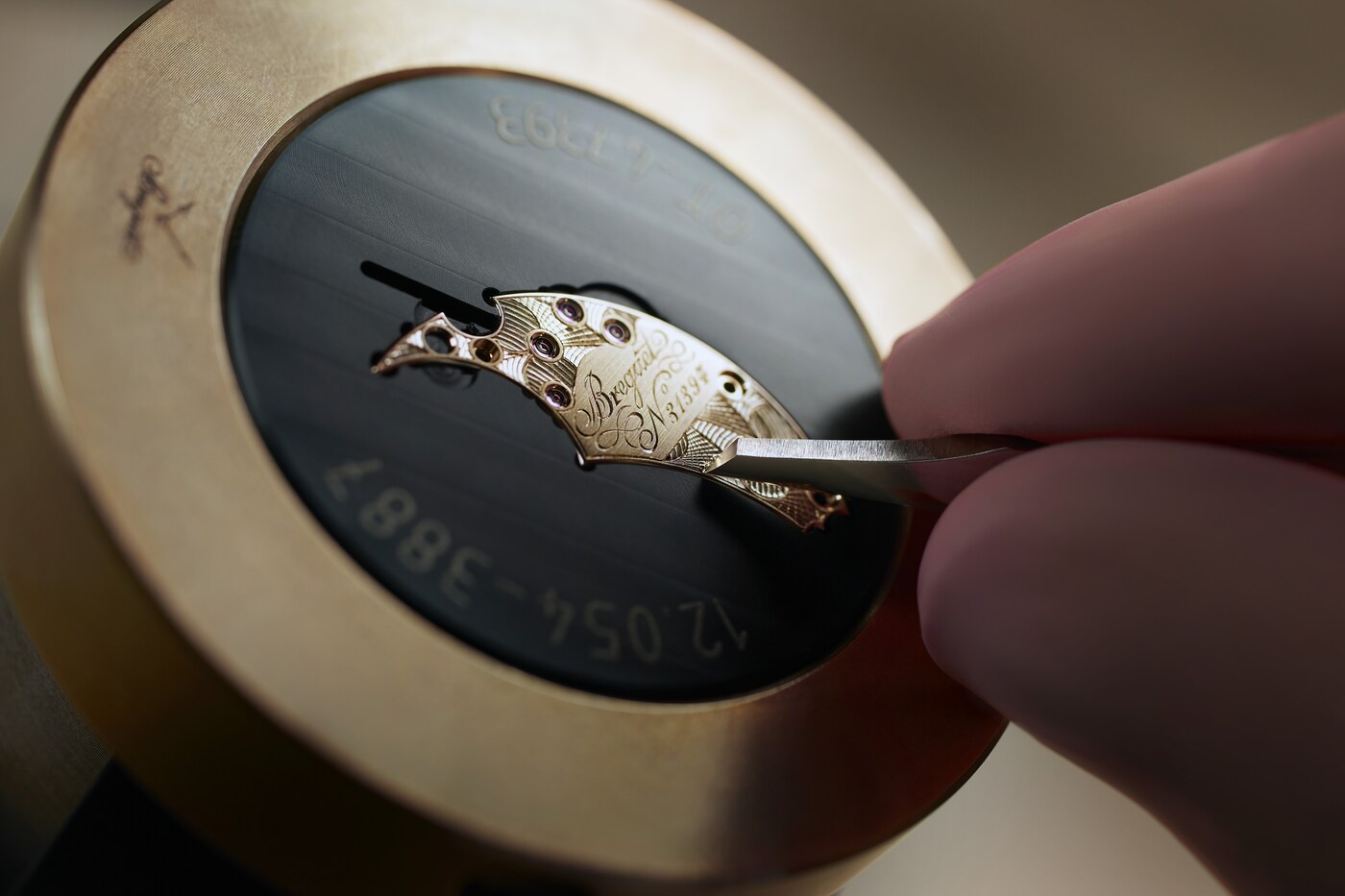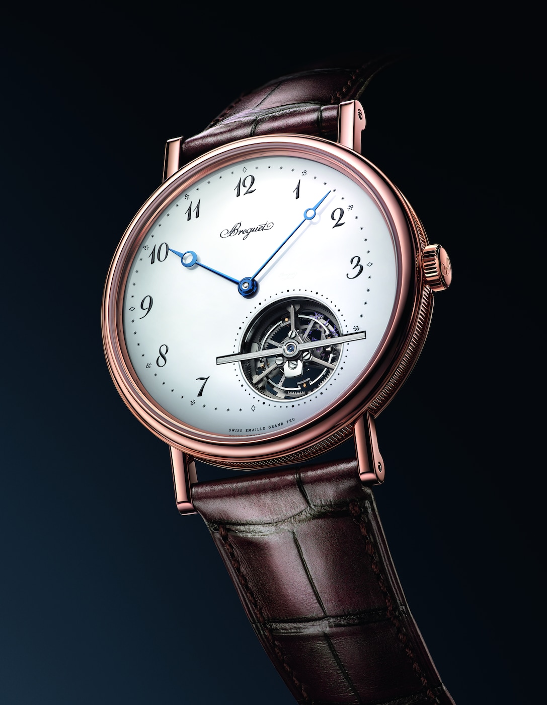 Le informazioni fornite dall’orologio sono state intenzionalmente ridotte al minimo con l’obiettivo di attirare lo sguardo verso l’elemento chiave: il tourbillon. Qui Breguet ha scelto un ponte del tourbillon grafico e smussato a mano, coronato da uno spinello. Le lancette azzurrate Breguet spiccano a contrasto con il tradizionale smalto bianco, assicurando una leggibilità perfetta di ore e minuti. Il giro delle ore in numeri arabi Breguet si presenta decentrato a ore 11, opposto al tourbillon posizionato a ore 5. La disposizione delle informazioni rimanda agli orologi da tasca firmati A. L. Breguet, che amava sovvertire le convenzioni estetiche dei segnatempo dell’epoca.