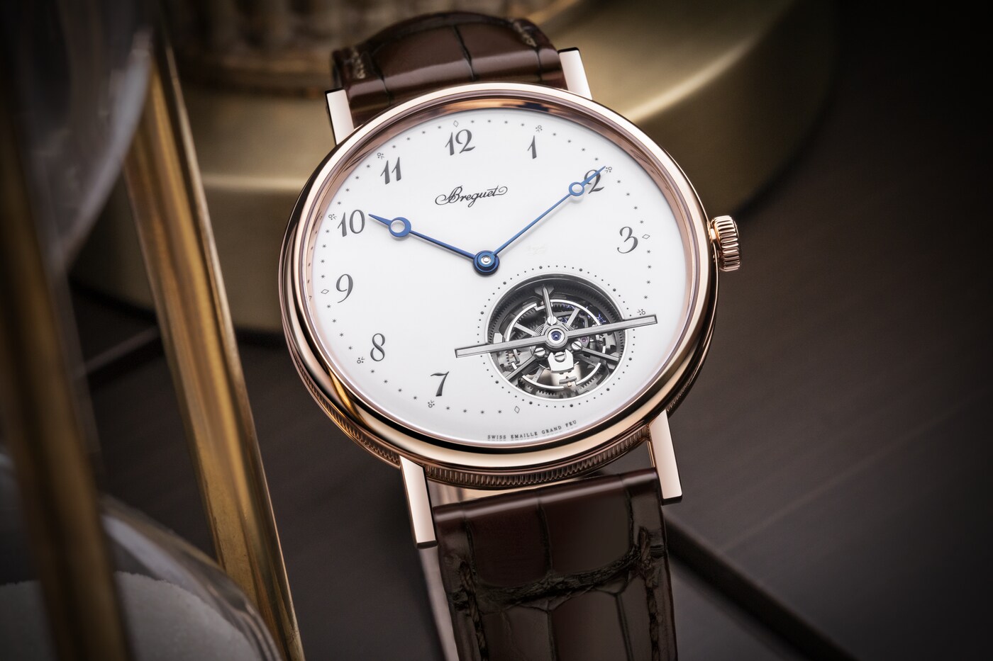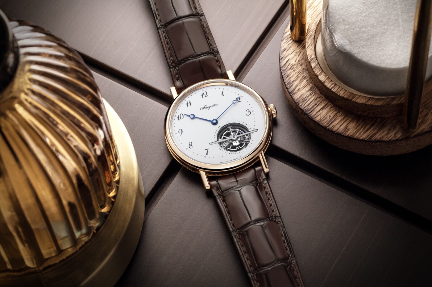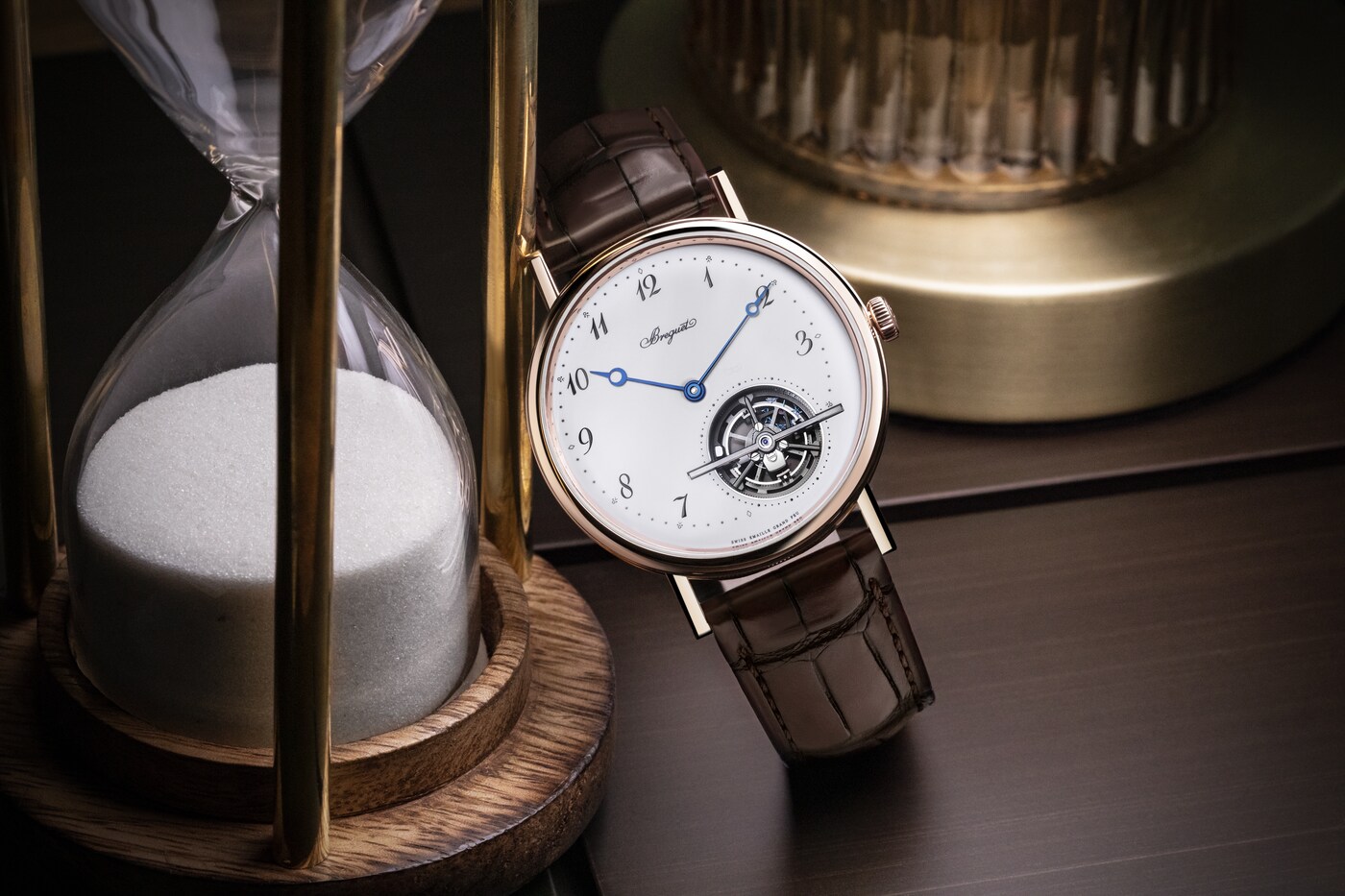 Le informazioni fornite dall’orologio sono state intenzionalmente ridotte al minimo con l’obiettivo di attirare lo sguardo verso l’elemento chiave: il tourbillon. Qui Breguet ha scelto un ponte del tourbillon grafico e smussato a mano, coronato da uno spinello. Le lancette azzurrate Breguet spiccano a contrasto con il tradizionale smalto bianco, assicurando una leggibilità perfetta di ore e minuti. Il giro delle ore in numeri arabi Breguet si presenta decentrato a ore 11, opposto al tourbillon posizionato a ore 5. La disposizione delle informazioni rimanda agli orologi da tasca firmati A. L. Breguet, che amava sovvertire le convenzioni estetiche dei segnatempo dell’epoca.