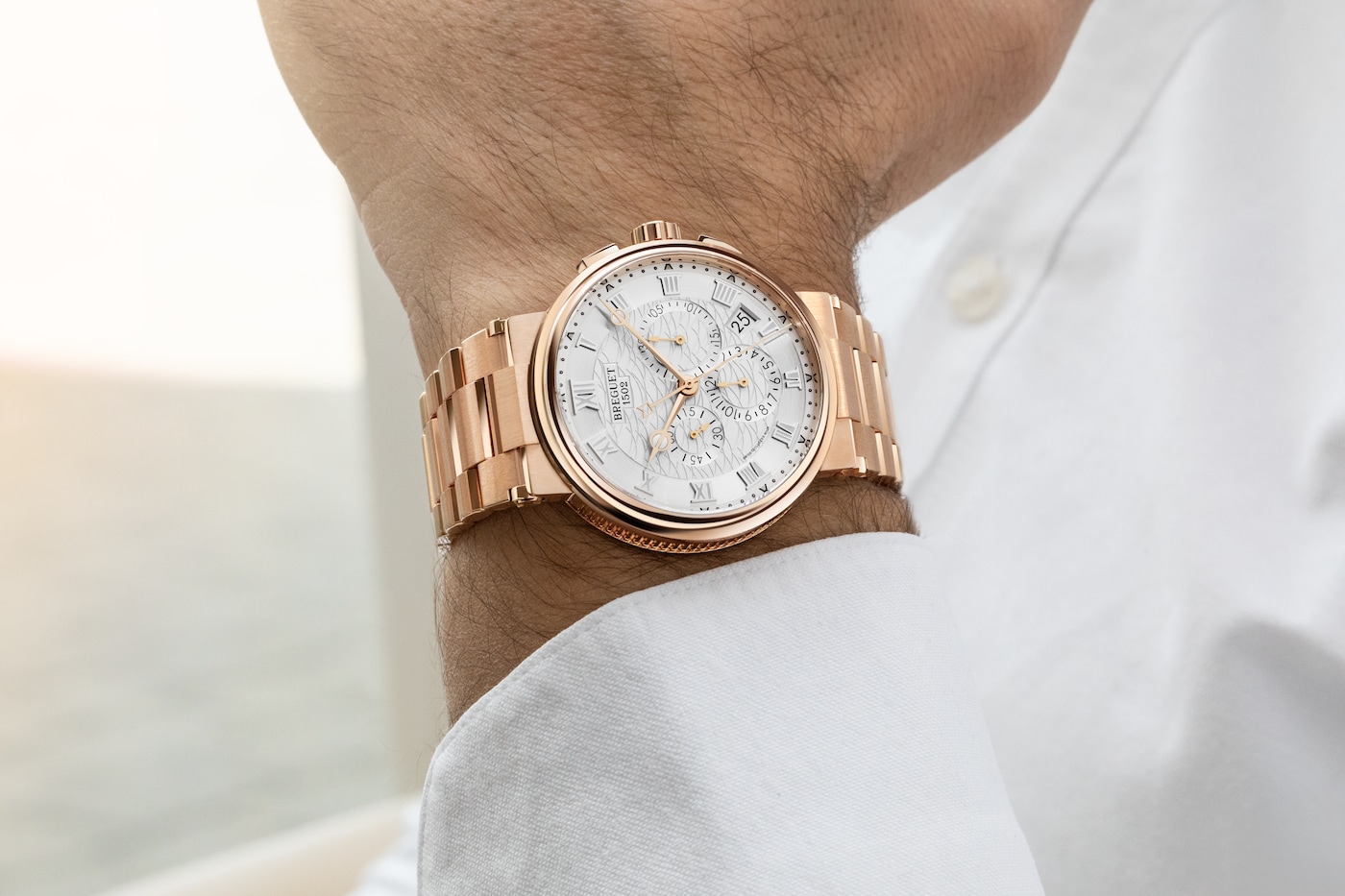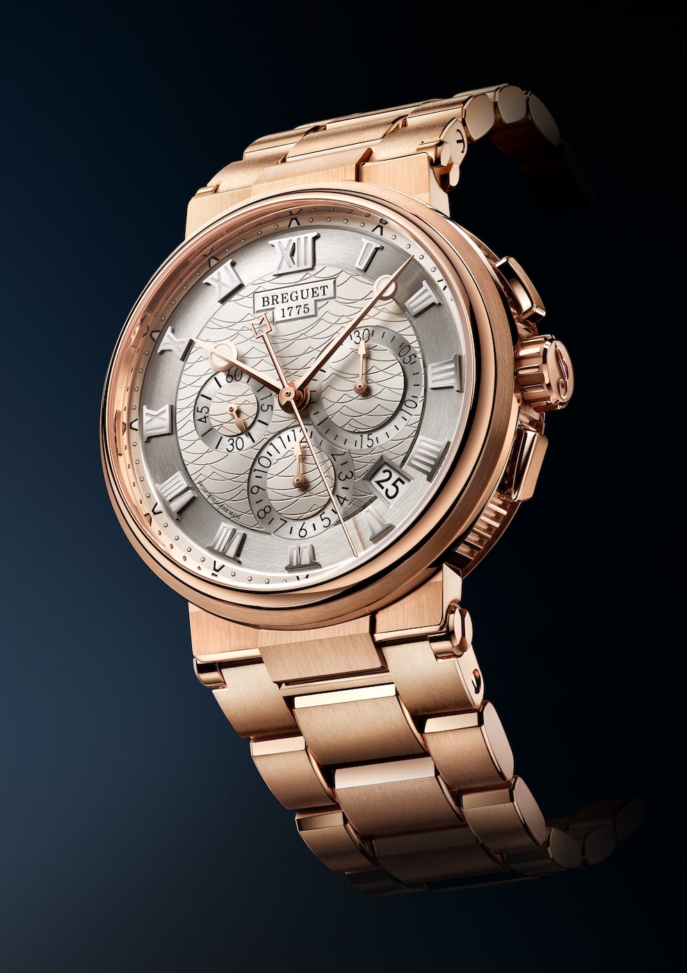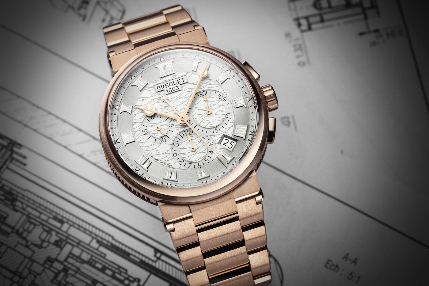 Questo segnatempo si distingue per la funzione cronografica “retour en vol”, indicata da una grande lancetta centrale, e per il datario posizionato tra le ore 4 e le 5.