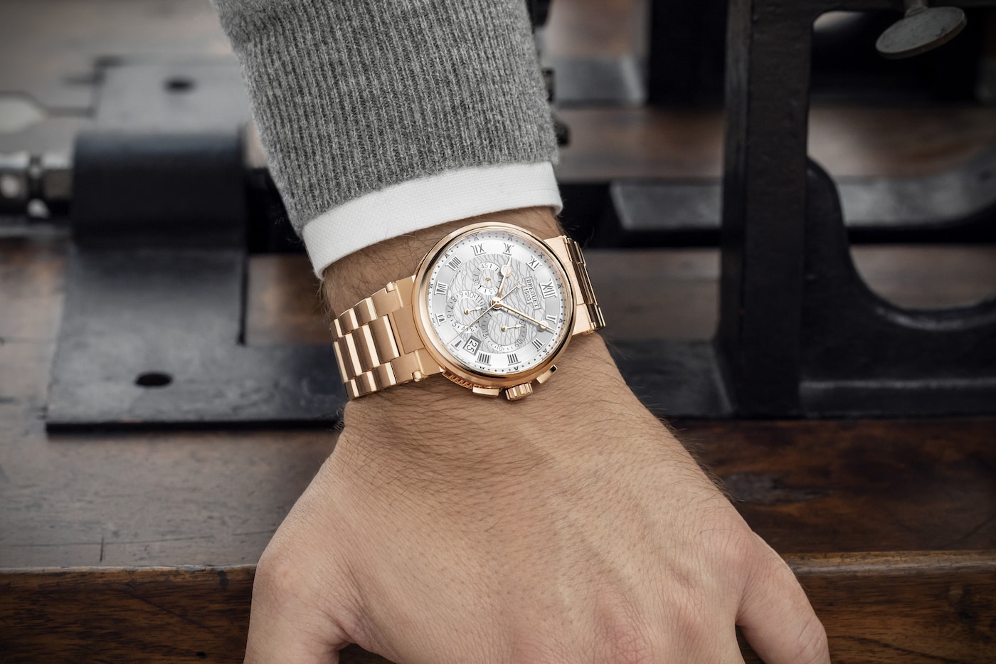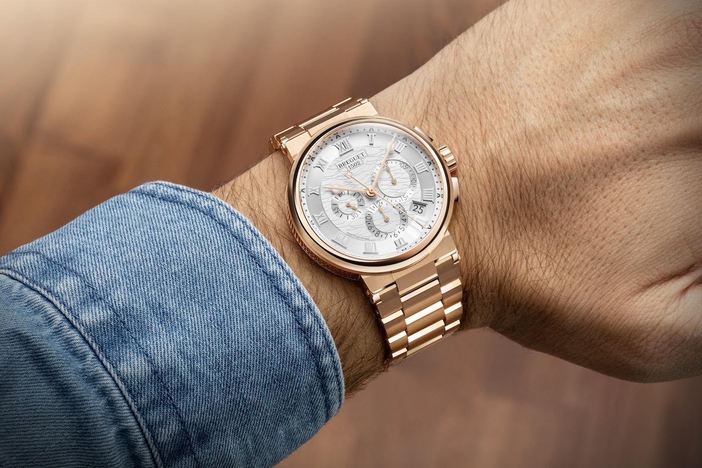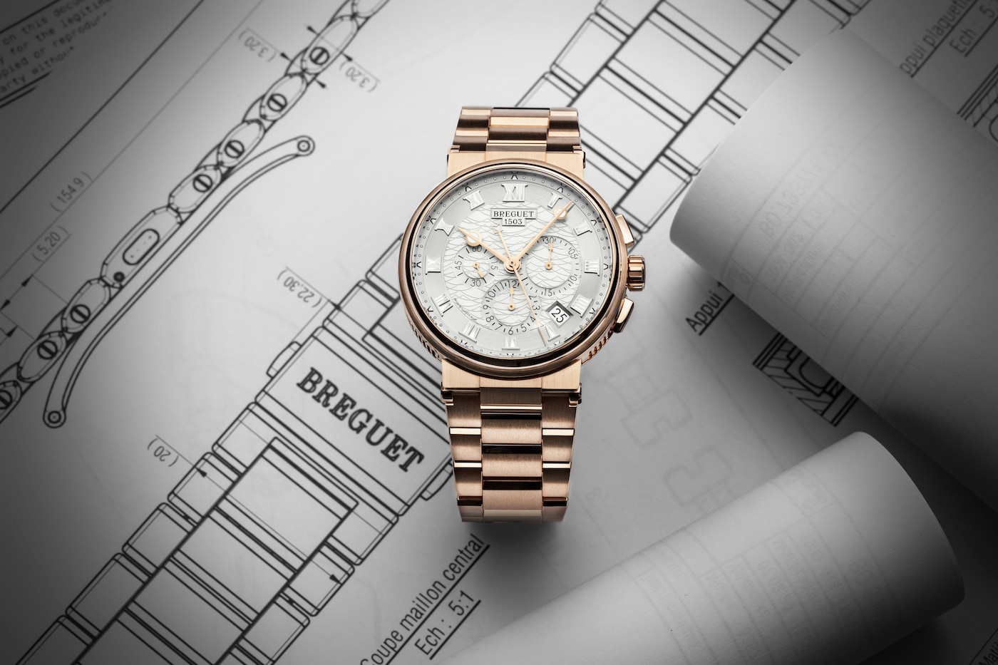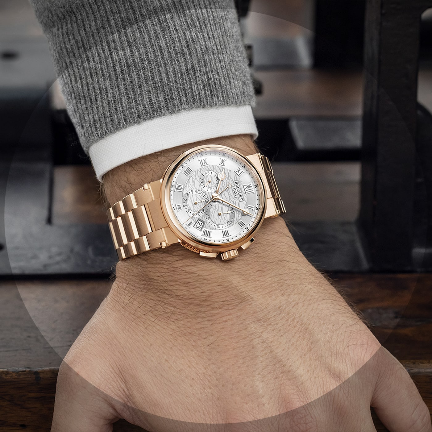 Questo segnatempo si distingue per la funzione cronografica “retour en vol”, indicata da una grande lancetta centrale, e per il datario posizionato tra le ore 4 e le 5.