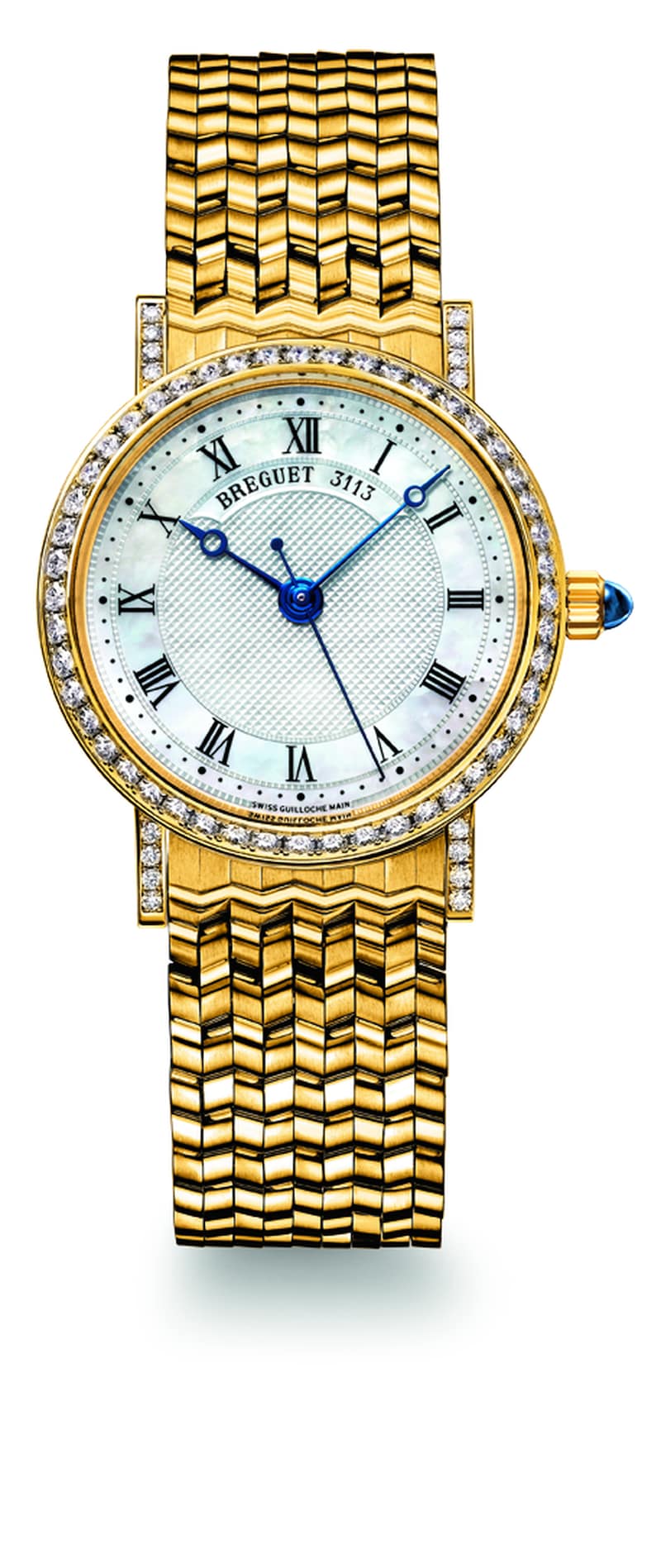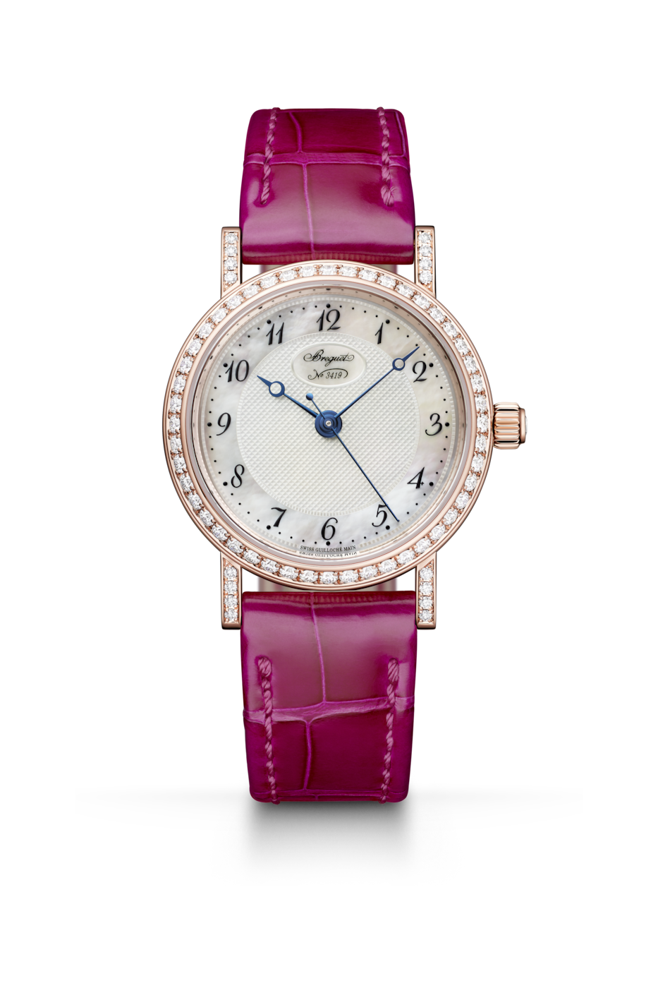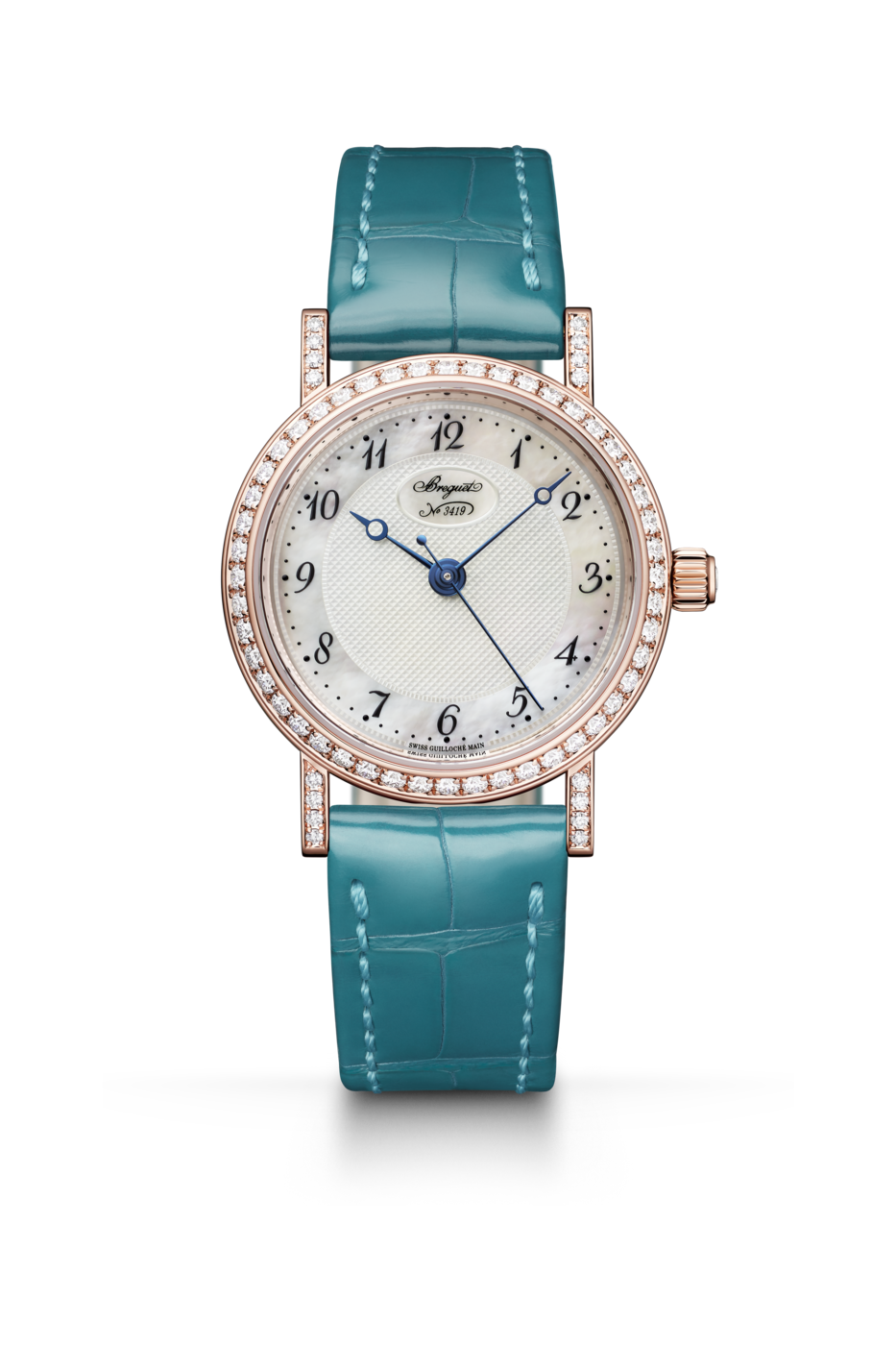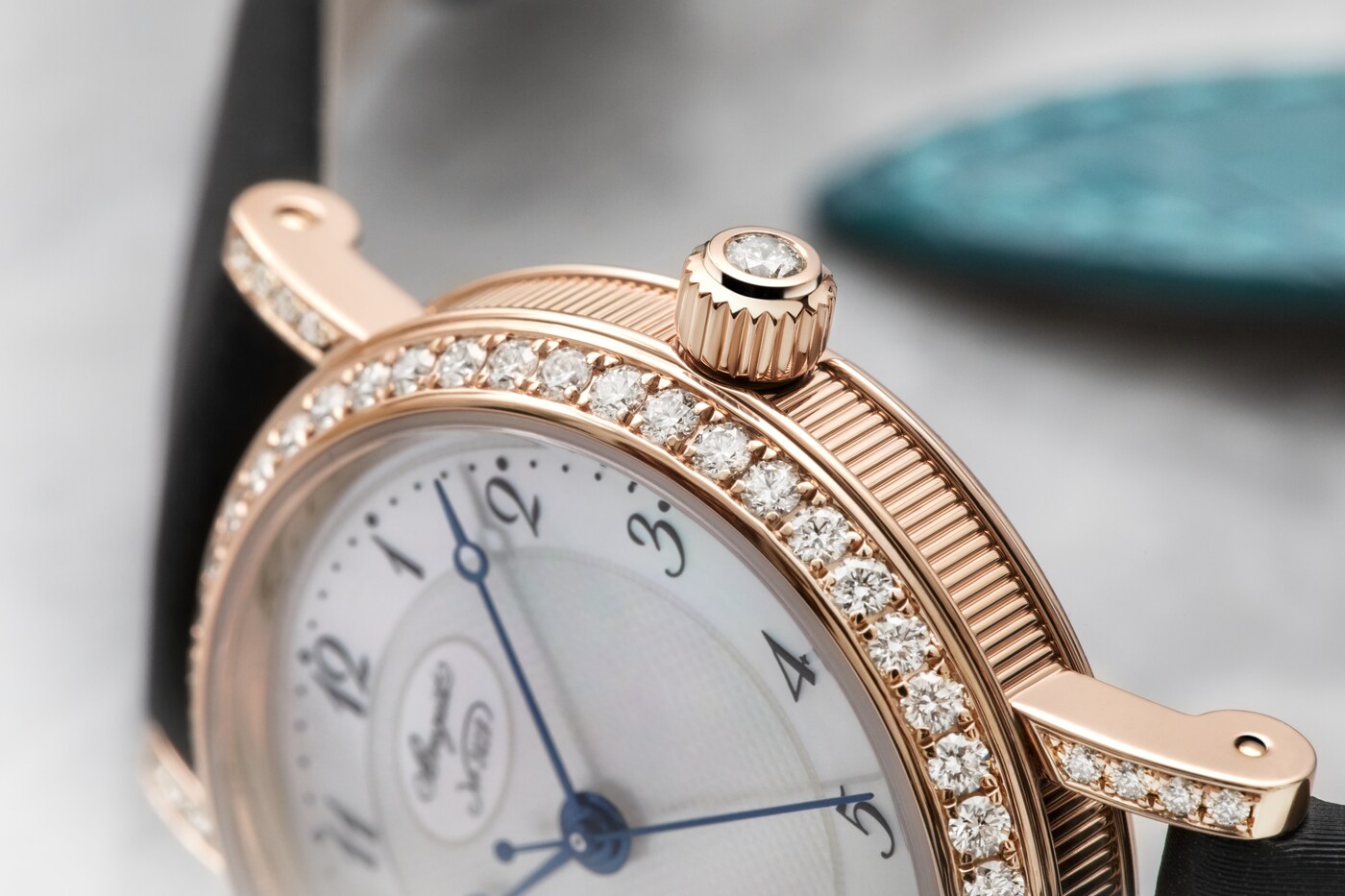 インターチェンジシステムは、工具を使わずご自身でストラップを簡単に交換していただけるよう考案されました。緻密なディテールのうちのひとつであるリュウズにはダイヤモンドカボション1個がセットされています。ケースは64個のブリリアントカット・ダイヤモンドがあしらわれたベゼルとラグを備えています。マザーオブパールダイヤルは緻密なギヨシェ彫りで装飾され、ブレゲ数字をあしらったチャプターリングで彩られています。