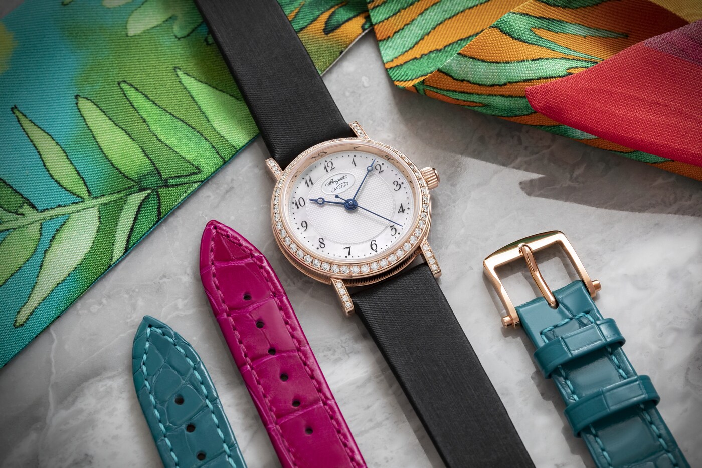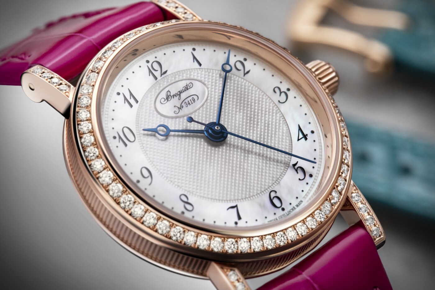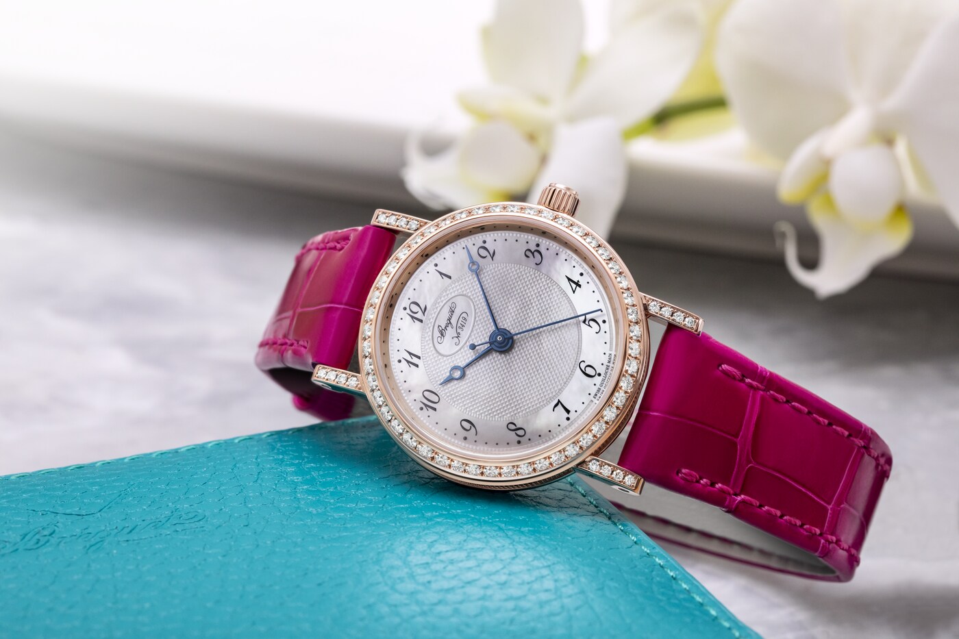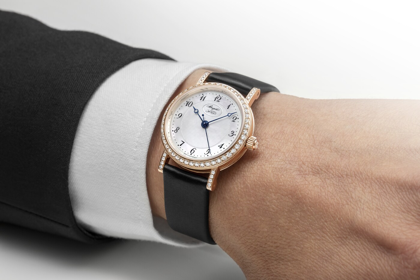 インターチェンジシステムは、工具を使わずご自身でストラップを簡単に交換していただけるよう考案されました。緻密なディテールのうちのひとつであるリュウズにはダイヤモンドカボション1個がセットされています。ケースは64個のブリリアントカット・ダイヤモンドがあしらわれたベゼルとラグを備えています。マザーオブパールダイヤルは緻密なギヨシェ彫りで装飾され、ブレゲ数字をあしらったチャプターリングで彩られています。