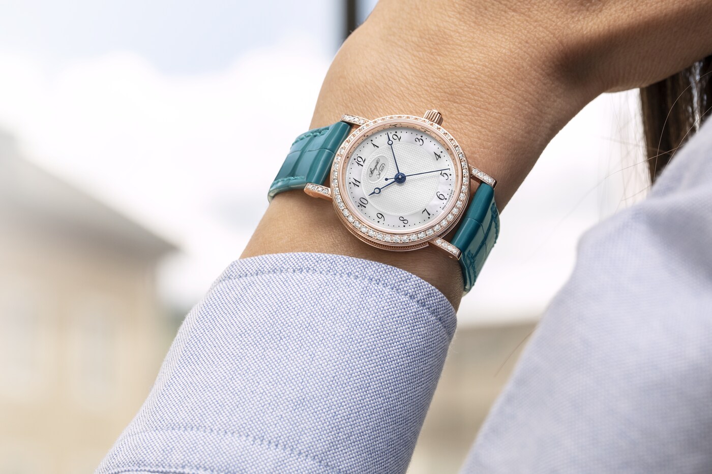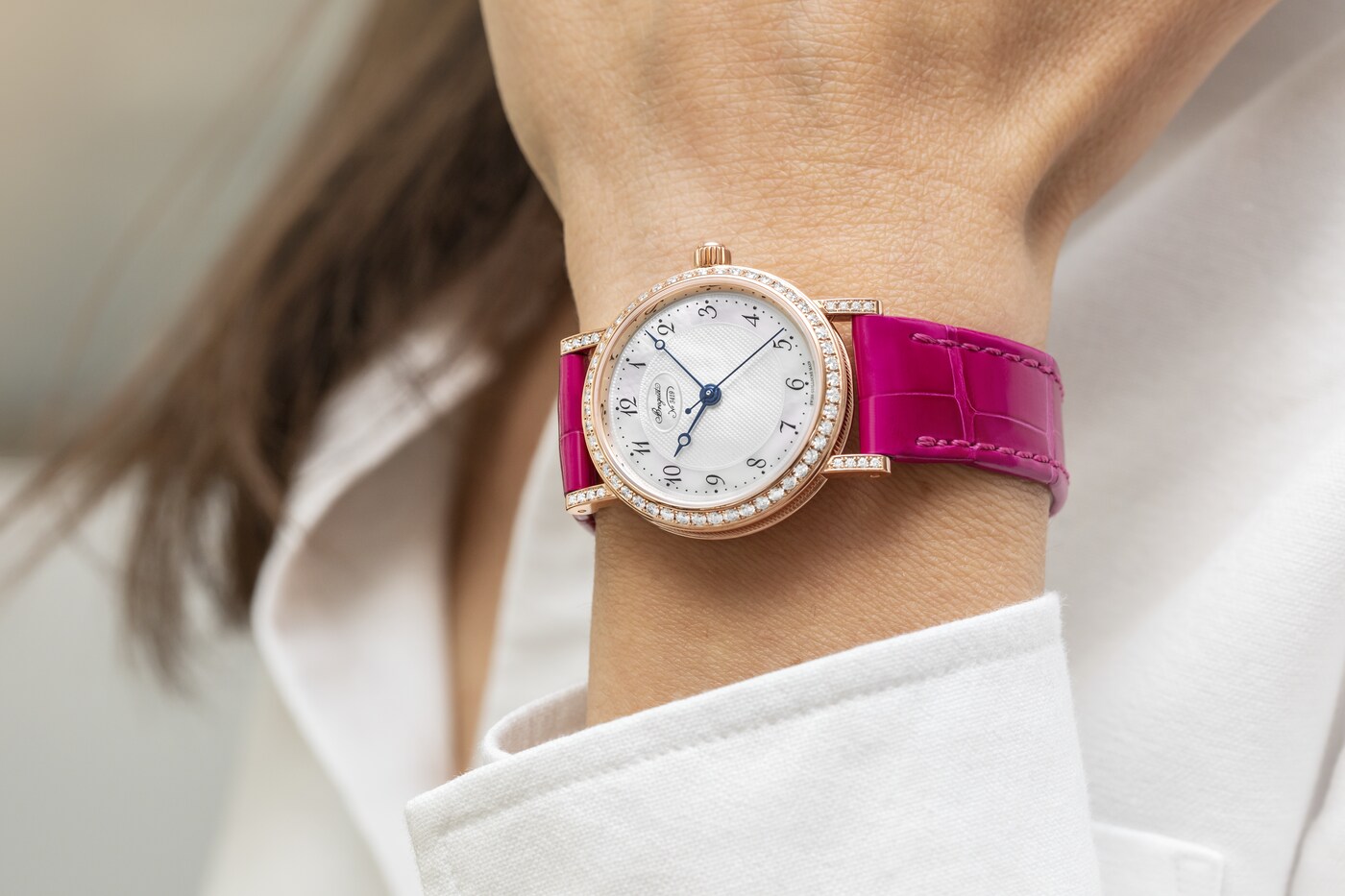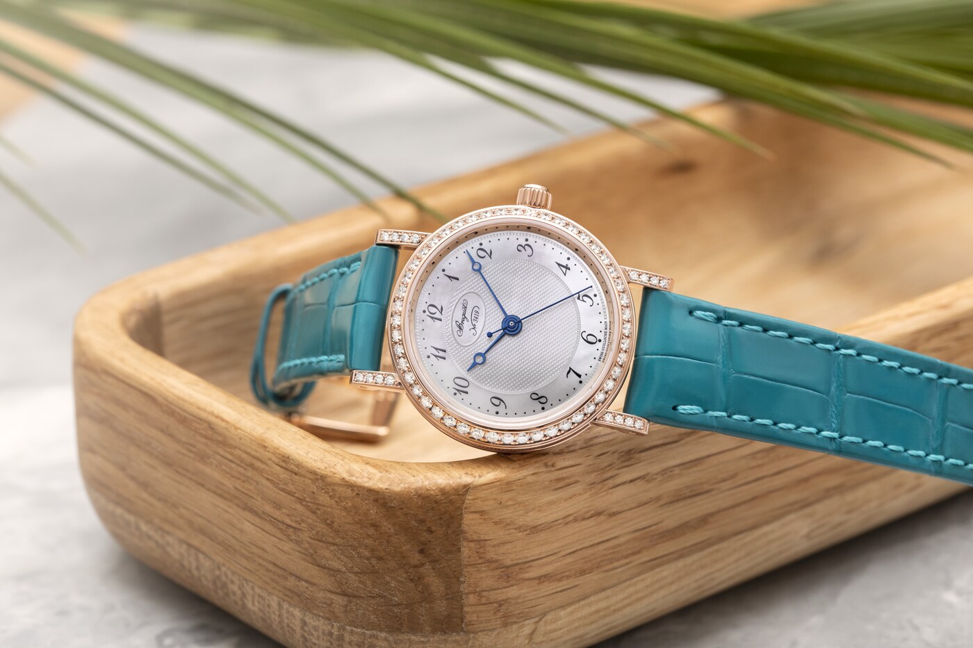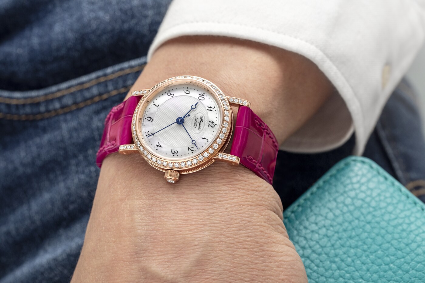 インターチェンジシステムは、工具を使わずご自身でストラップを簡単に交換していただけるよう考案されました。緻密なディテールのうちのひとつであるリュウズにはダイヤモンドカボション1個がセットされています。ケースは64個のブリリアントカット・ダイヤモンドがあしらわれたベゼルとラグを備えています。マザーオブパールダイヤルは緻密なギヨシェ彫りで装飾され、ブレゲ数字をあしらったチャプターリングで彩られています。
