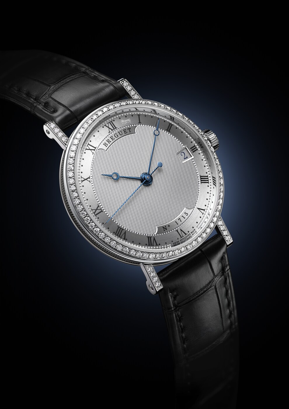 ブレゲはこの33.5mmのモデルに多くのバリエーションを用意しています。ホワイトまたはローズゴールド製ケースを備えた文字盤には、ホワイトナチュラルマザーオブパールまたは「クル・ド・パリ」模様のギヨシェ彫りが採用されています。またベゼルとラグにダイヤモンドをセッティングを施し鮮やかに仕上げらたモデルもあります。
