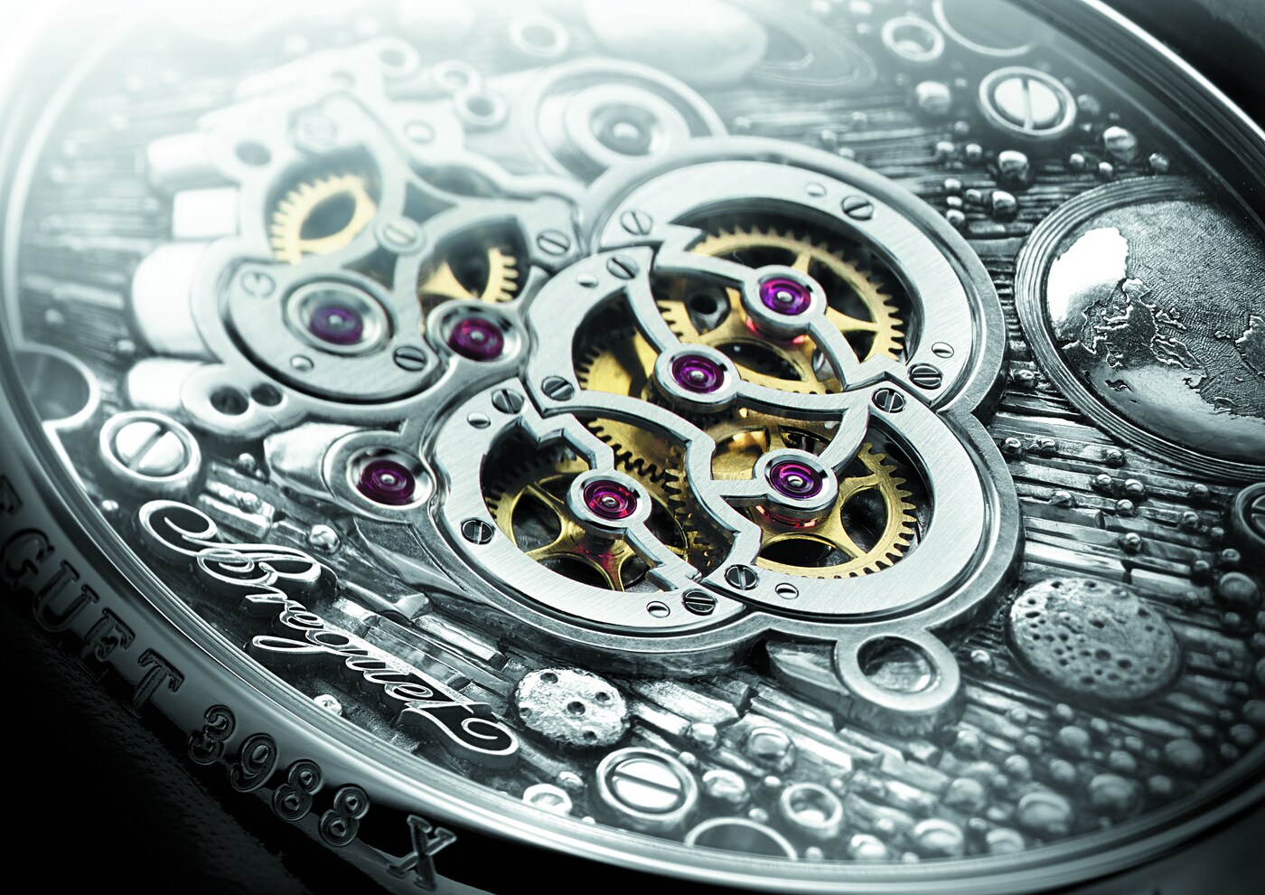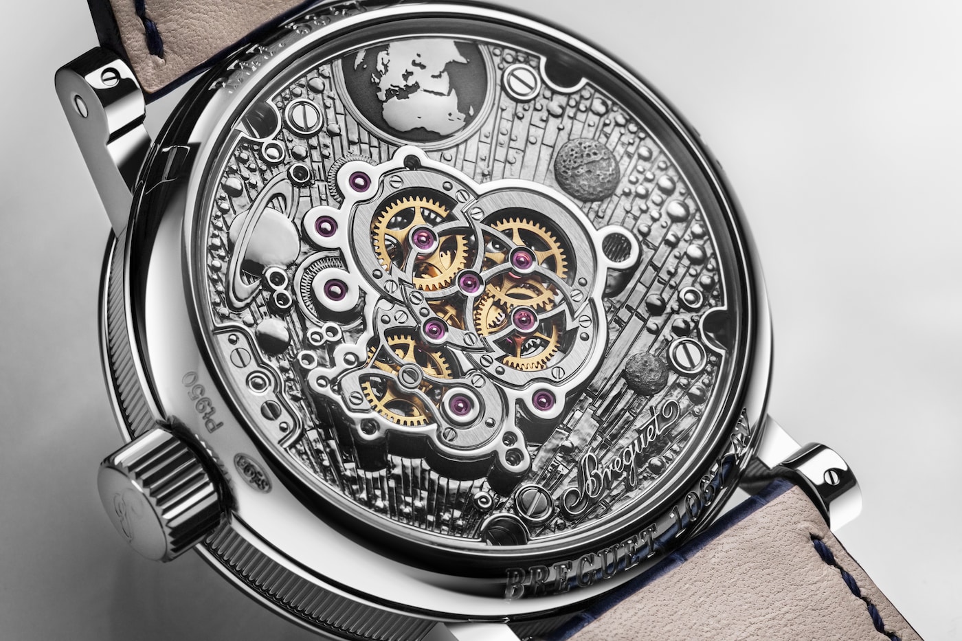 各トゥールビヨンは1分間で1回転しながら、機構全体は軸の回りを12時間で1回転します。連結された調整機構は二重の回転を行うのです。時間は、2つのトゥールビヨンを連結し、針の役割を担うブリッジによって指し示され、分は中央のクラシックなブレゲ針で表示されます。