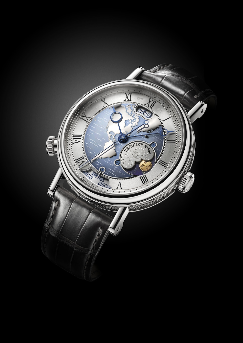 アメリカ大陸、ヨーロッパ・アフリカ大陸、またはアジア・オセアニア大陸を描いた文字盤を備えたこの機械式時計は、メモリ機能付きのインスタント・ジャンプ・タイムゾーン表示を初めて搭載しています。