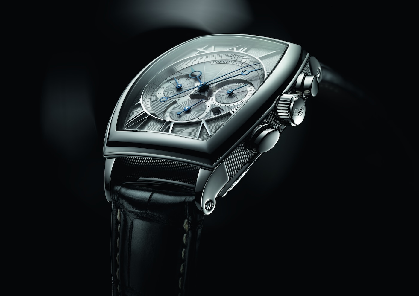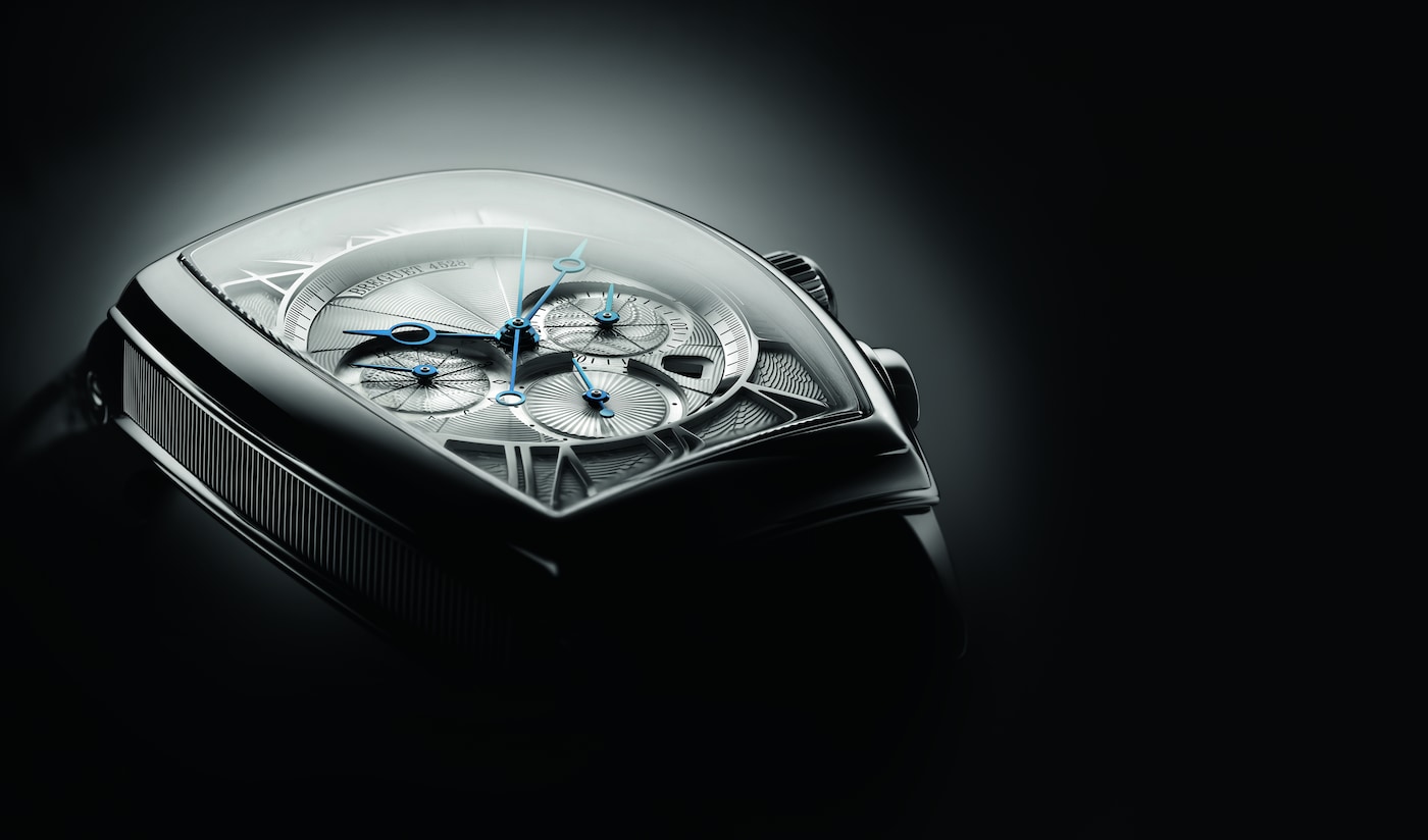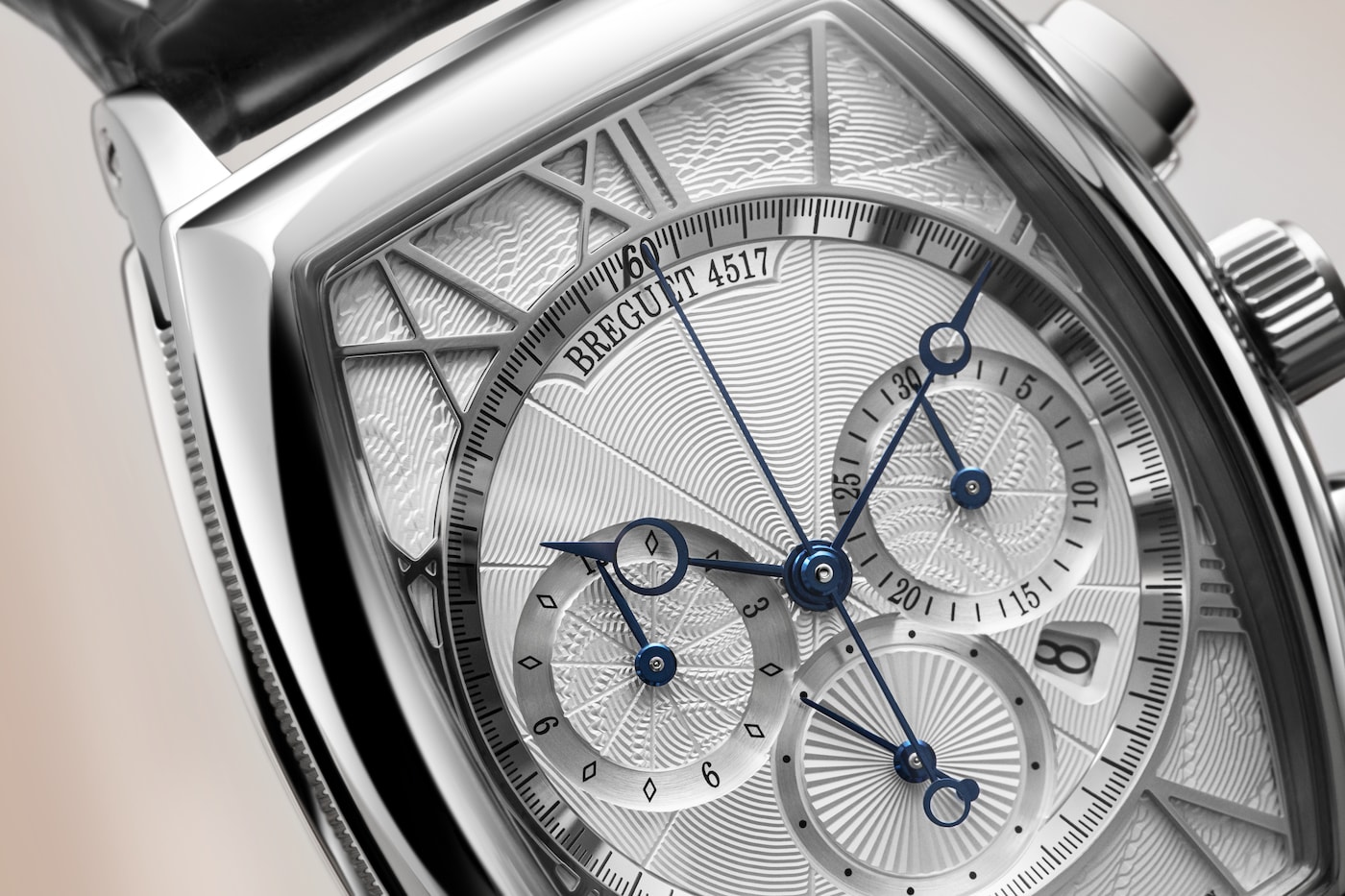 ケース径42 x 35mmのこのモデルのシルバー仕上げゴールドの文字盤は、ギヨシェ装飾などのさまざまな装飾や仕上げによって、それぞれの表示を際立てています。そこには、チャプターリングの内側に交互に配した“フランケ”、メインダイヤルへの“ドラぺ・モワレ”、3時位置と9時位置に配された30分計と12時間計の“フラメ”、9時位置のスモールセコンドの“ソレイユ・ラディアント”といったギヨシェ彫りがあしらわれ、ブルー仕上げのスティール製針が全体のデザインを引き立てています。