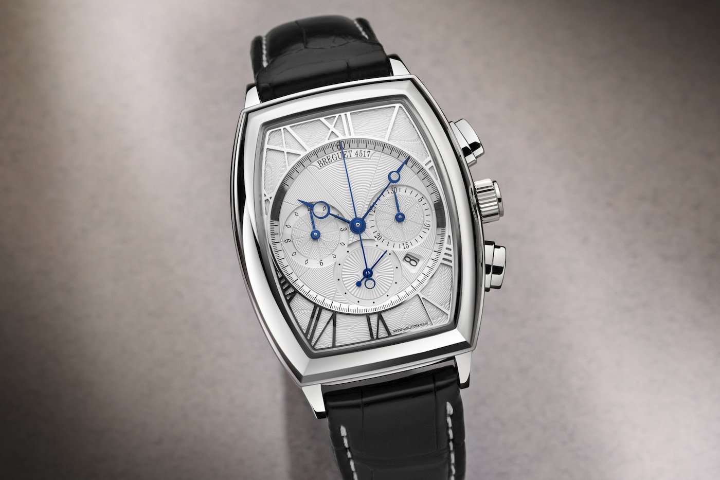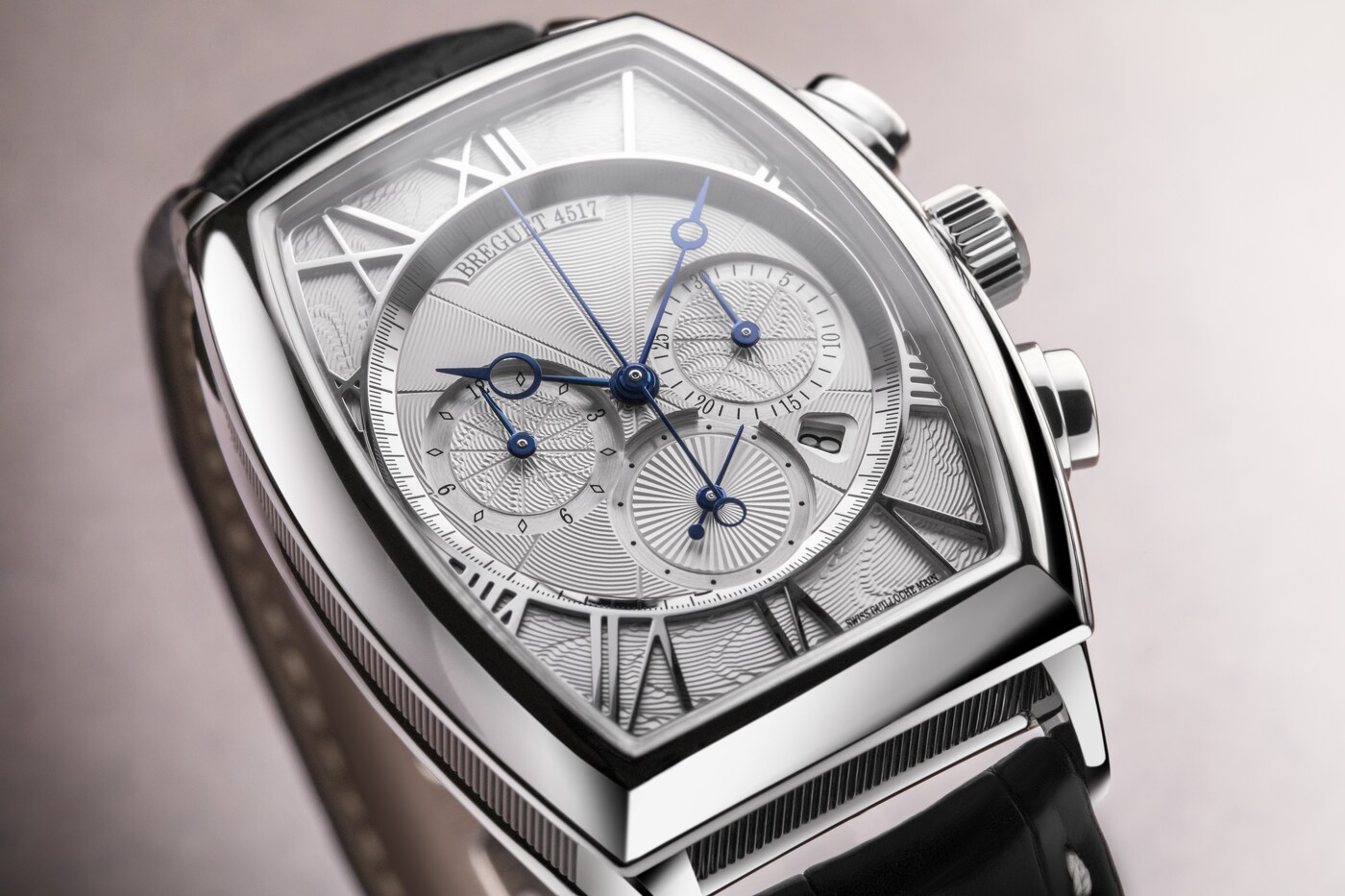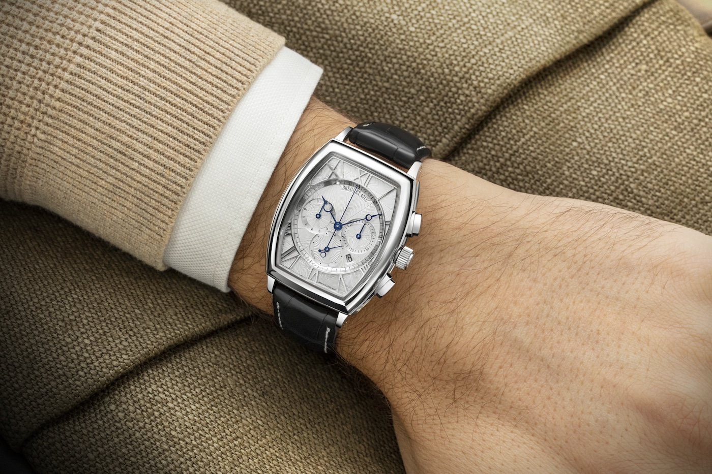 ケース径42 x 35mmのこのモデルのシルバー仕上げゴールドの文字盤は、ギヨシェ装飾などのさまざまな装飾や仕上げによって、それぞれの表示を際立てています。そこには、チャプターリングの内側に交互に配した“フランケ”、メインダイヤルへの“ドラぺ・モワレ”、3時位置と9時位置に配された30分計と12時間計の“フラメ”、9時位置のスモールセコンドの“ソレイユ・ラディアント”といったギヨシェ彫りがあしらわれ、ブルー仕上げのスティール製針が全体のデザインを引き立てています。