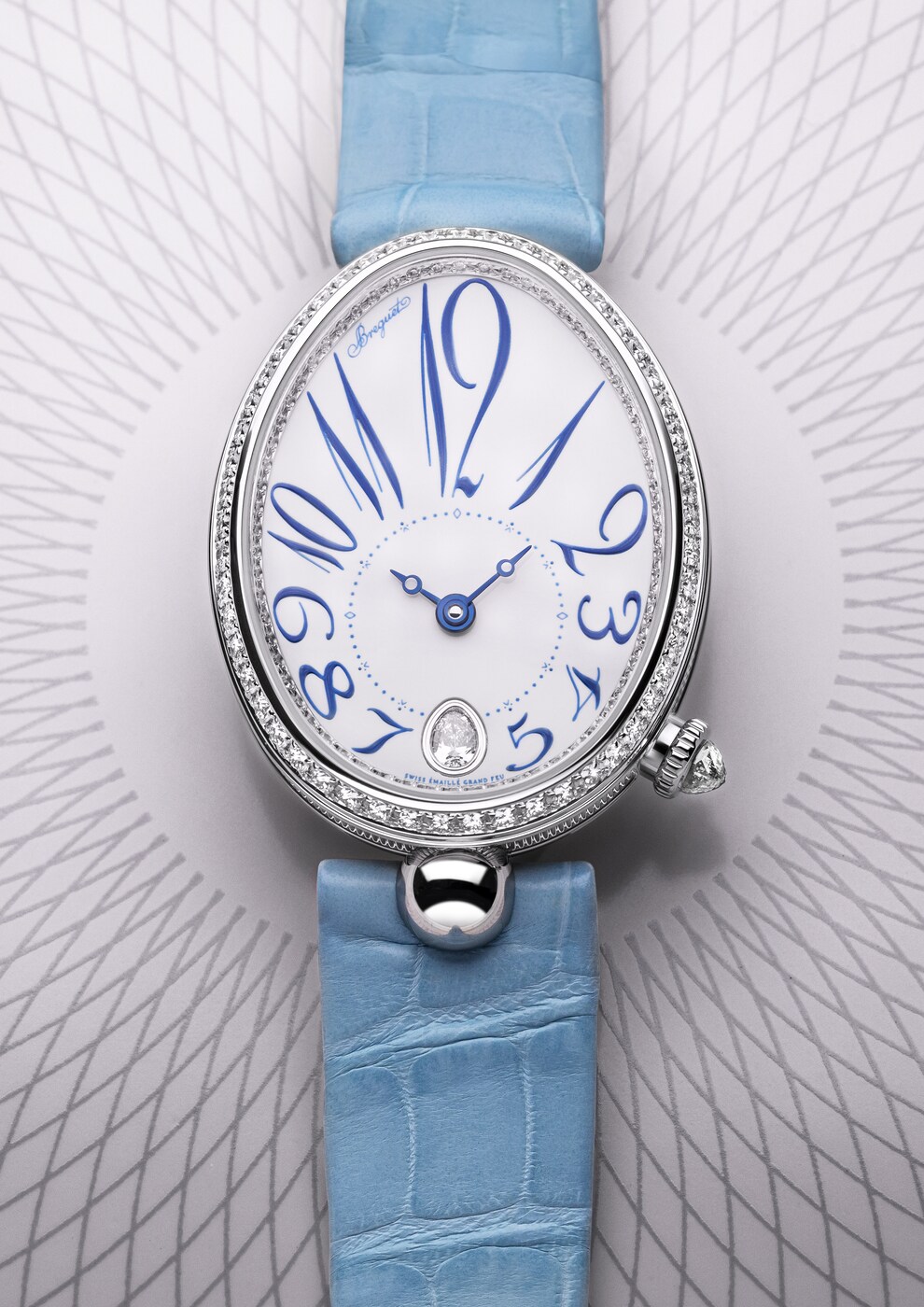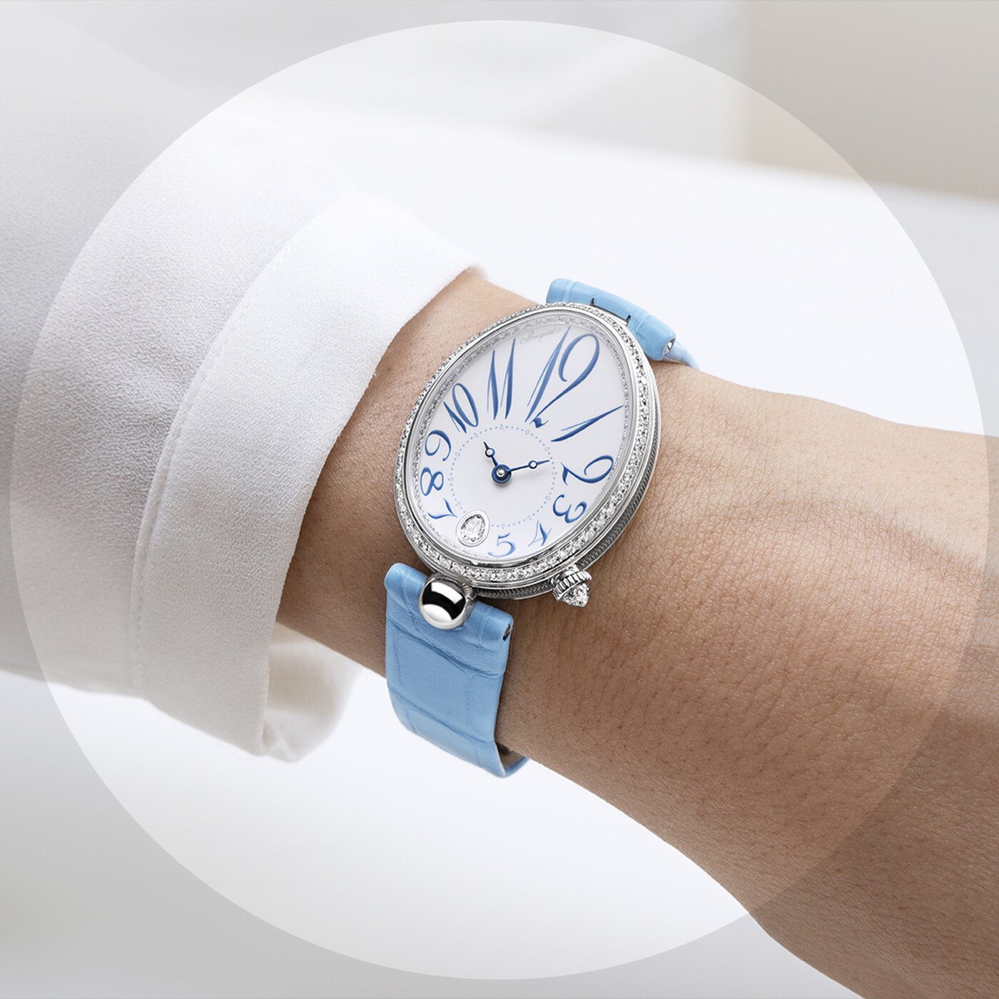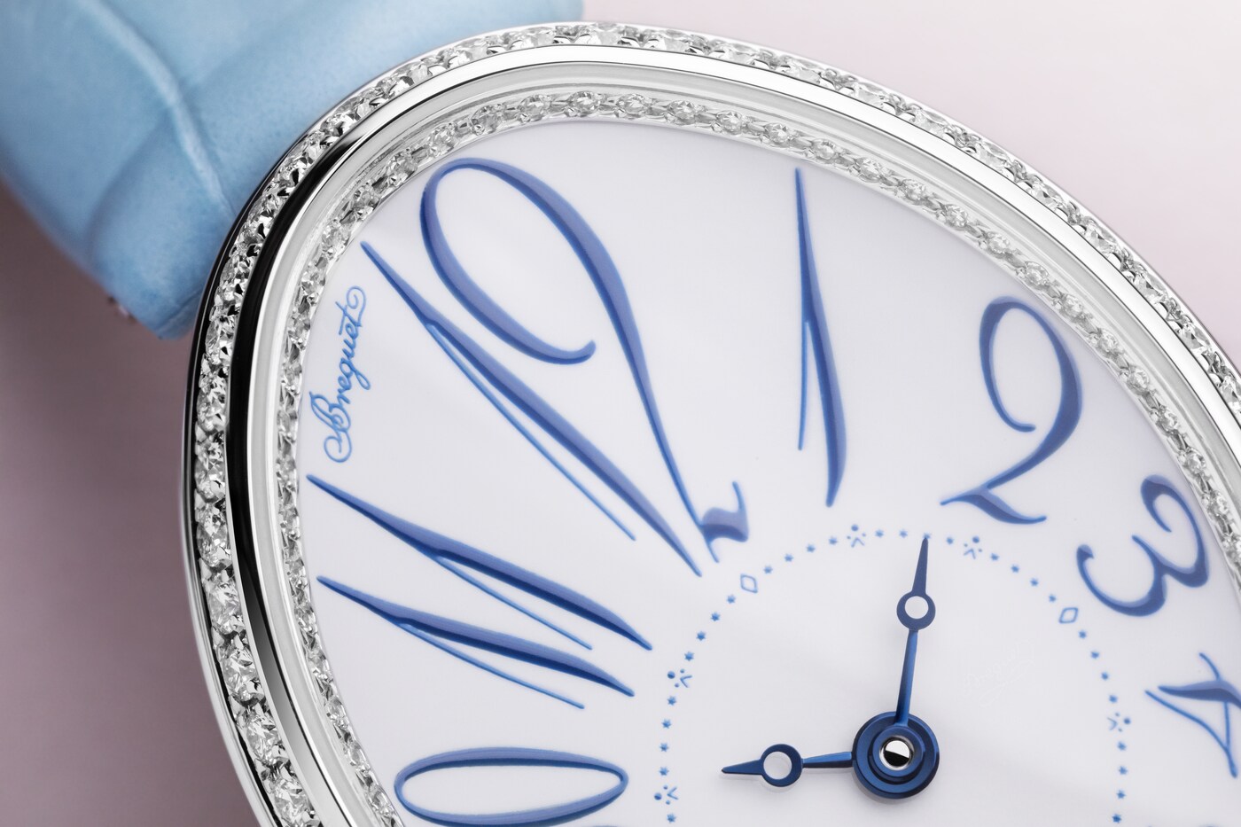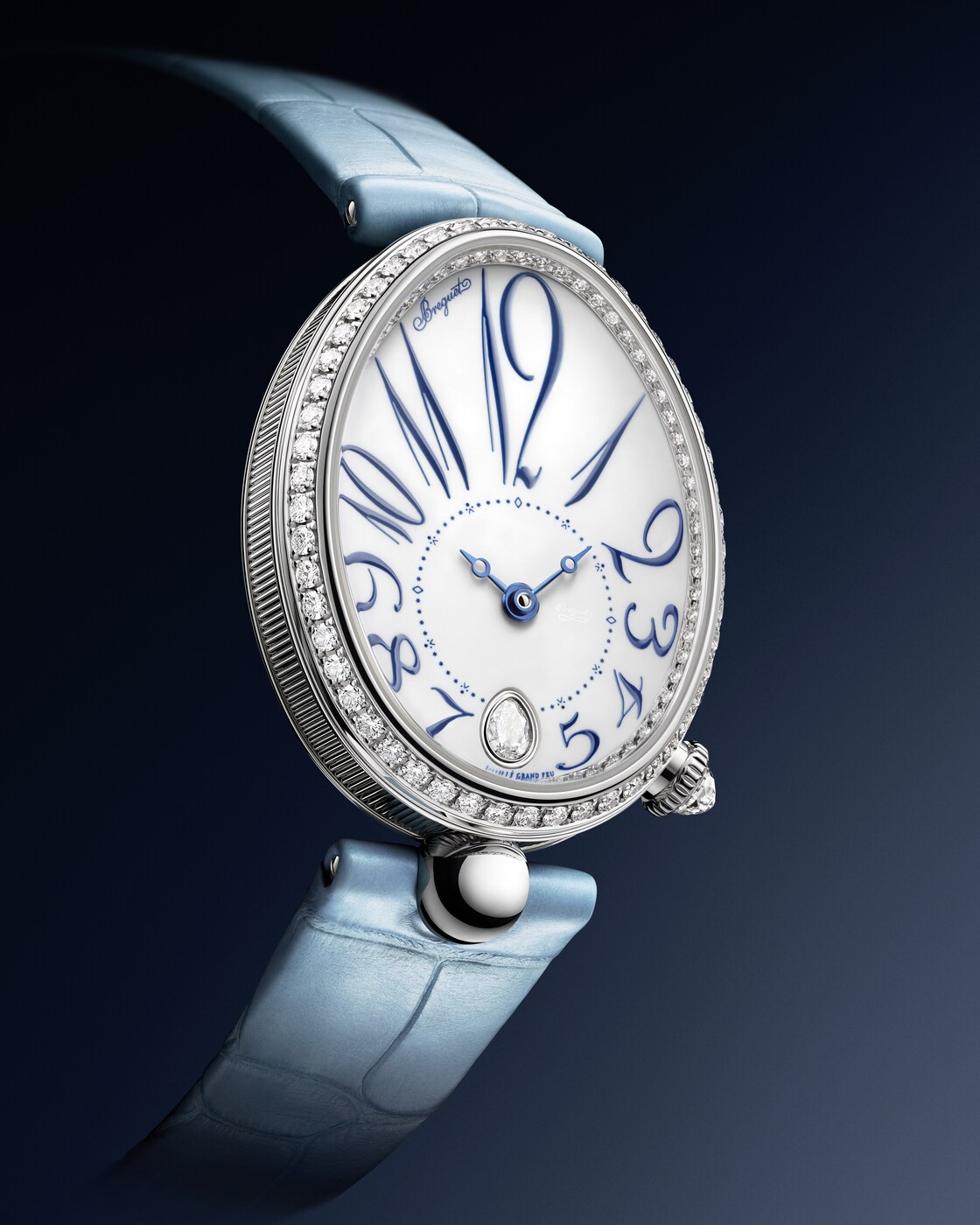 ダイヤルのカーブと美しく融合しながらチャプターリングを囲む、丸みを強調してアレンジされたブレゲ数字が際立つモデルです。