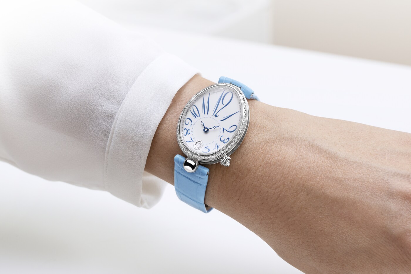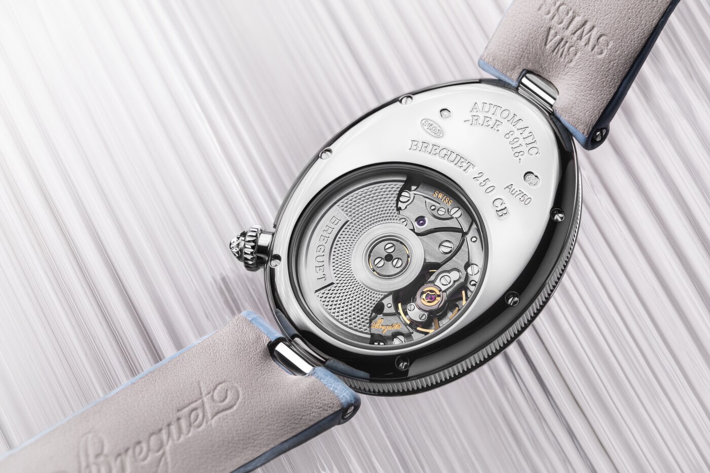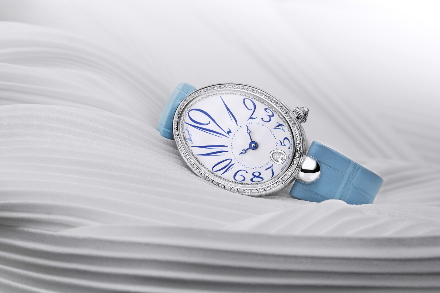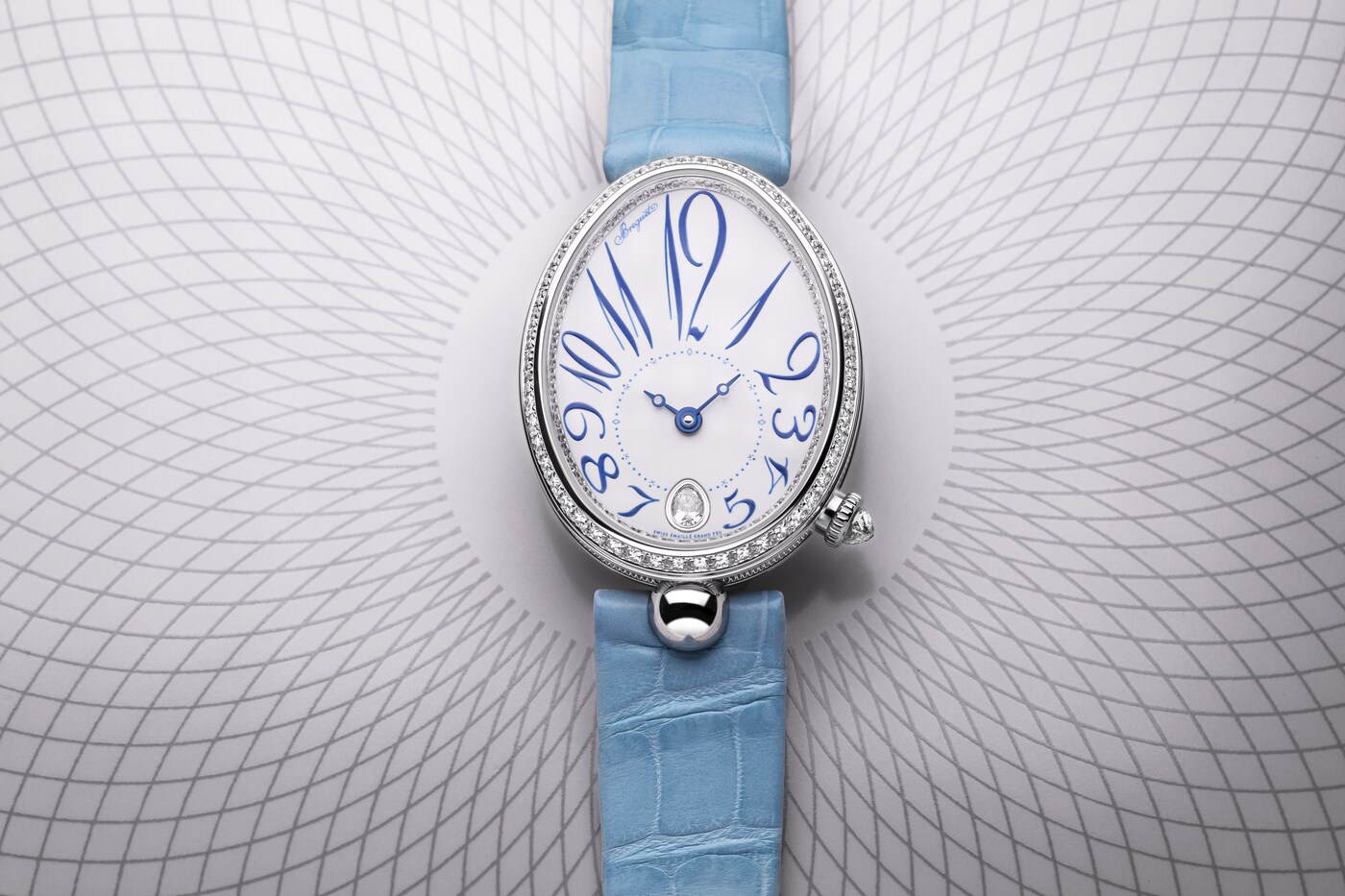 ダイヤルのカーブと美しく融合しながらチャプターリングを囲む、丸みを強調してアレンジされたブレゲ数字が際立つモデルです。