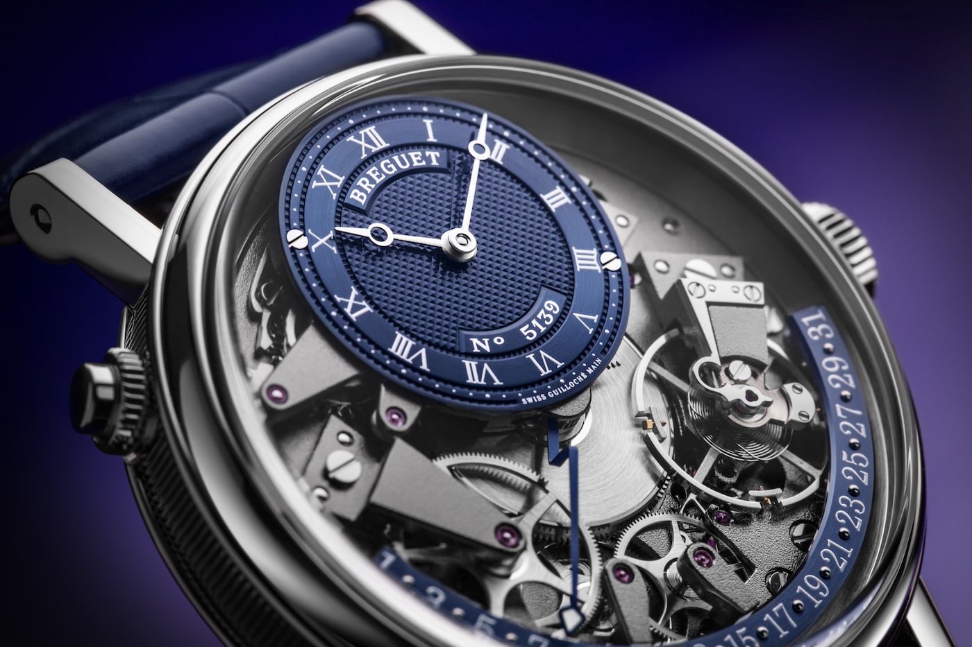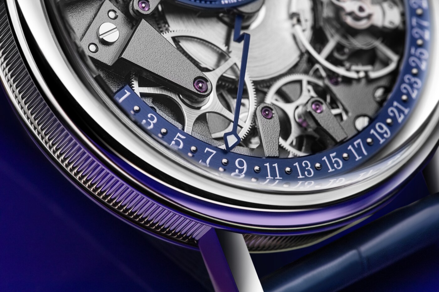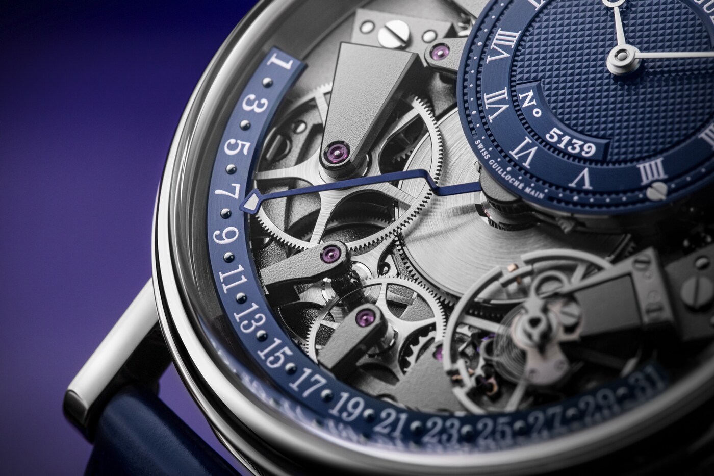 オフセンターに配されたダイヤル上で、時間と分を指し示す伝統的なブレゲ針とは別に、驚くべきデザインで際立つもう1本の針があります。横から見ると、いくつかの高さになるよう曲げてデザインされたその針は、3時から9時の間の日付表示を、ムーブメントのいくつもの部品を飛び越えて移動していきます。レトログラード式表示であるため、月の最終日に到達したら1の位置に戻ります。レトログラード日付複雑機構をいち早く完成させたのは、創業者アブラアン-ルイ・ブレゲでした。