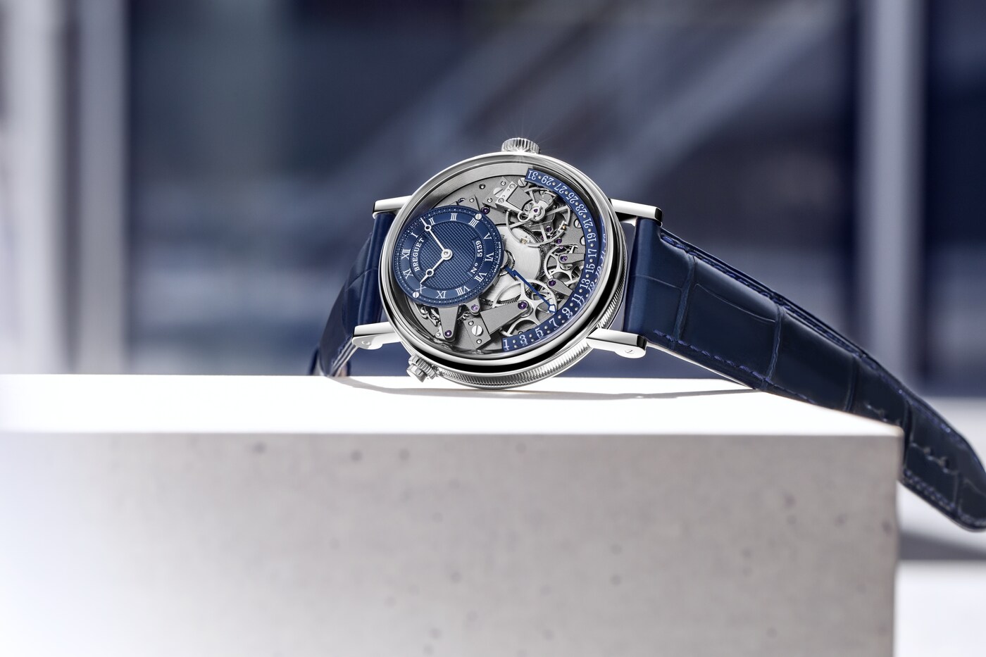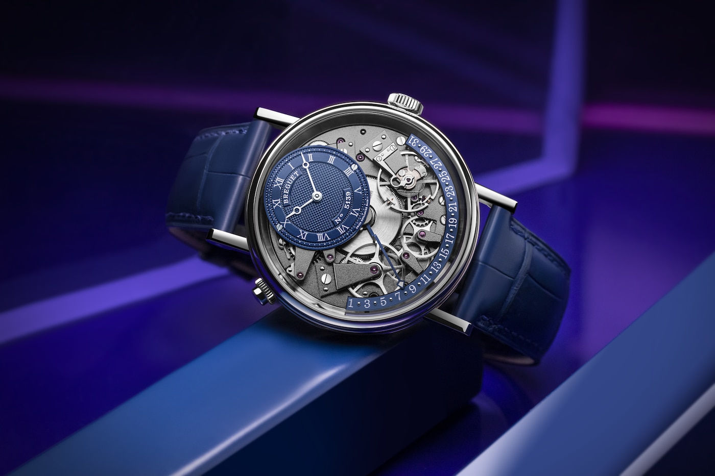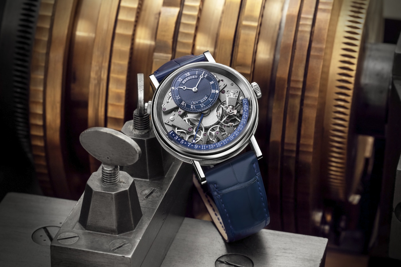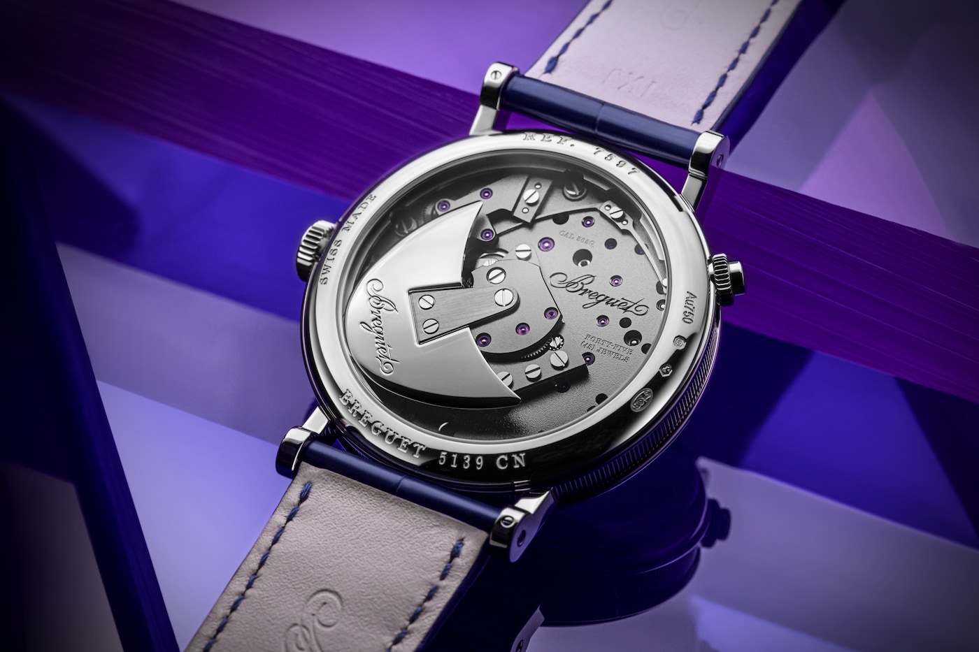 オフセンターに配されたダイヤル上で、時間と分を指し示す伝統的なブレゲ針とは別に、驚くべきデザインで際立つもう1本の針があります。横から見ると、いくつかの高さになるよう曲げてデザインされたその針は、3時から9時の間の日付表示を、ムーブメントのいくつもの部品を飛び越えて移動していきます。レトログラード式表示であるため、月の最終日に到達したら1の位置に戻ります。レトログラード日付複雑機構をいち早く完成させたのは、創業者アブラアン-ルイ・ブレゲでした。