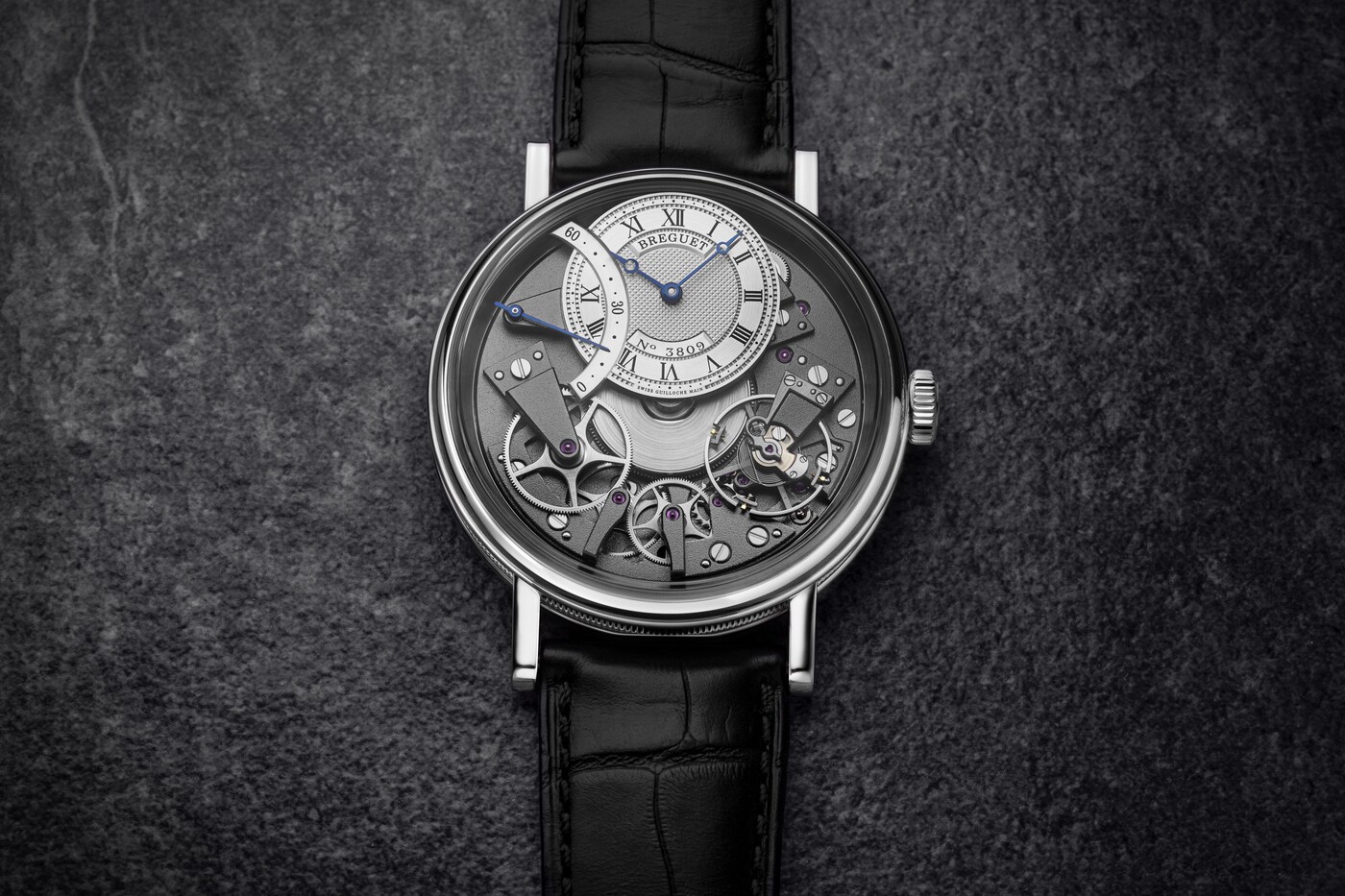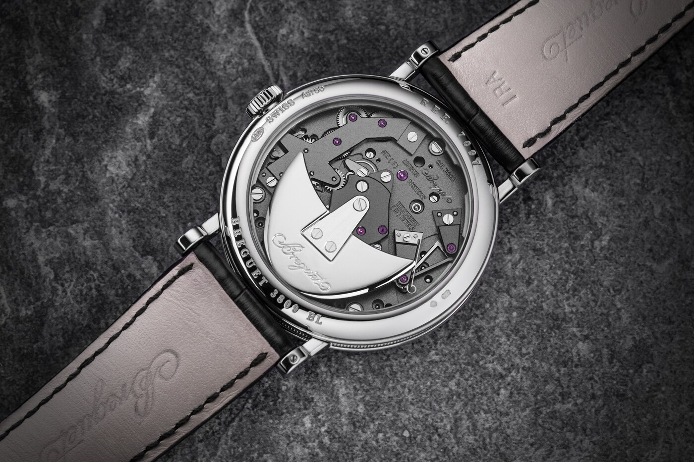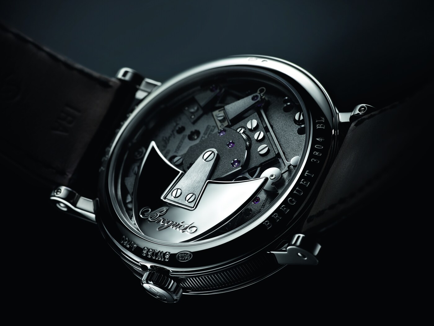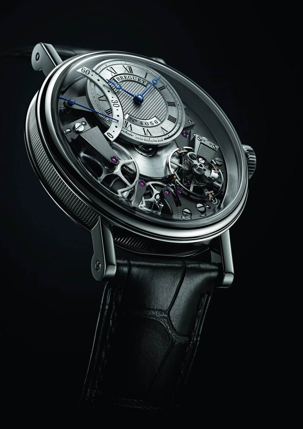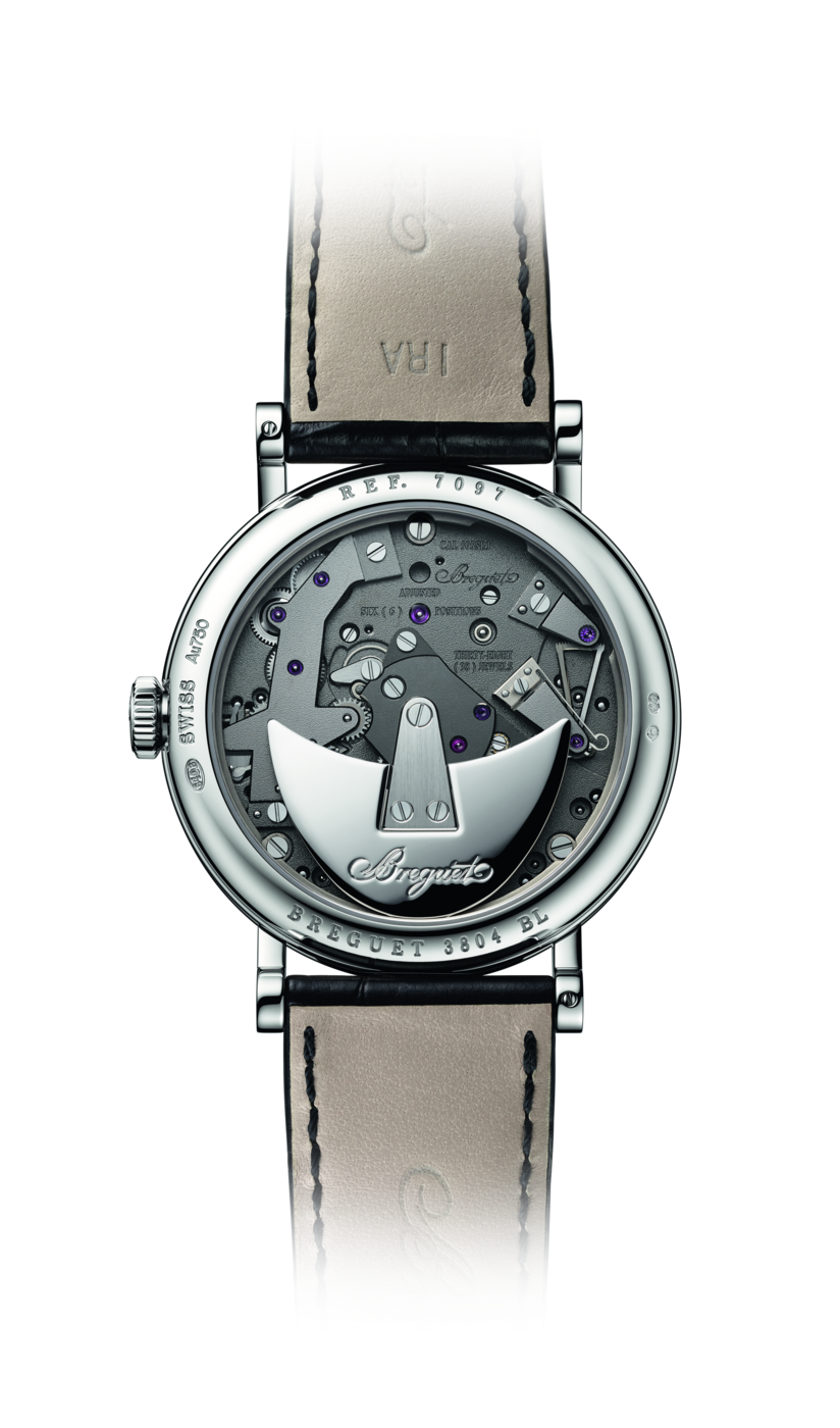 完全にシンメトリーなこの時計は、紛れもなく「トラディション」コレクションの一員であることを証明しています。通常であれば文字盤の下に隠されている、ブリッジ、歯車、脱進機、香箱、その他のムーブメントの部品はここでは地板の上で見えるように配されています。このモデルのもう1つの重要な機構は、4時位置に配された「パラシュート」機構。ブレゲが発明したこの機構はテンプの軸を衝撃から守ります。パラシュートは、現代の「インカブロック」をはじめとするあらゆる衝撃防止機構の先駆けです。