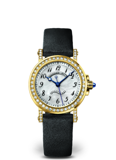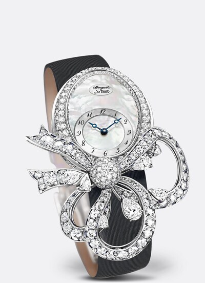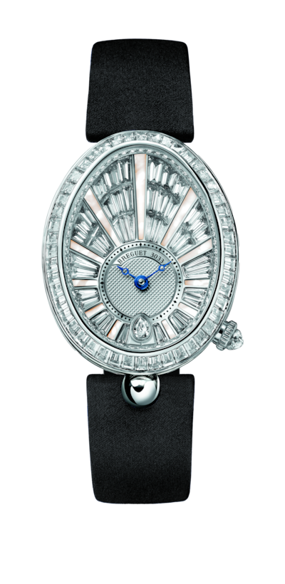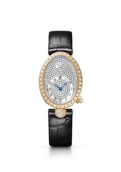 ブレゲのコレクションで初めて、ブラックの「グラン・フー」エナメルダイヤルを備えた「クイーン・オブ・ネイプルズ」モデルが発表されます。ブレゲ数字が渦を巻く新しいフェイスは、ブリリアントカット ダイヤモンドで取り囲まれおり、数字の「6」の位置には、壮麗なペアシェイプのダイヤモンドがあしらわれています。…