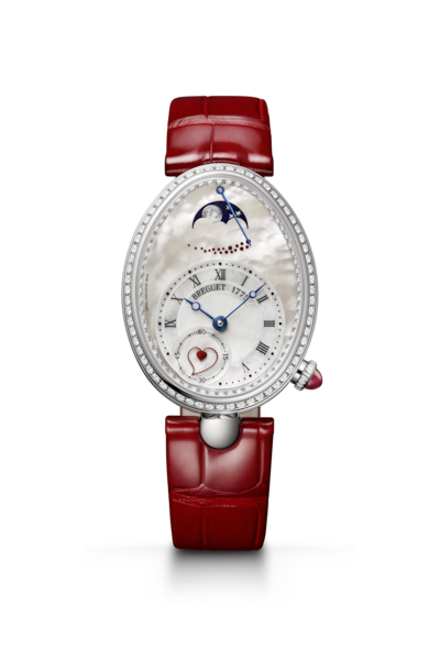 新しい「クラシック ムーンフェイズ」は愛にオマージュを捧げます。 マザーオブパールのダイヤルには、ブレゲ・マニュファクチュールの職人の手作業による非常に繊細なギヨシェ彫りの模様が施されています。ダイヤルにはブレゲ数字と6個のルビーが交互に並び…