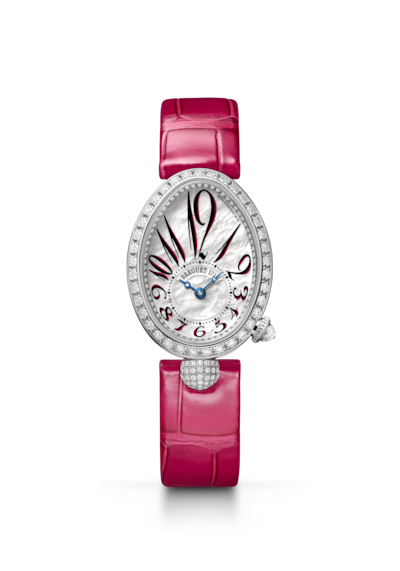 ブラックとホワイトのモデルに続き、クイーン・オブ・ネイプルズにピンクの色彩が加わります。ローズゴールドのケース、117個のダイヤモンドをあしらったベゼルとフランジ、そして1つのダイヤモンドをあしらったリュウズが、フェミニンで洗礼された視覚的な調和を生み出しています。ライトピンクをまとった文字盤には…