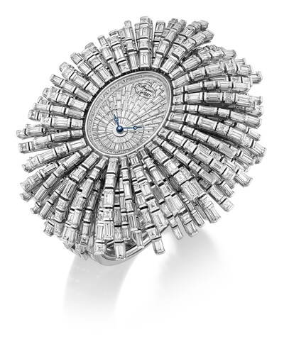 一つ目のホワイトゴールド製モデルは、星降る夜の夢へと誘います。魅惑的なダイヤモンドのカスケードは、パール仕上げとニス塗装を施したミッドナイトブルーのマザーオブパールダイヤルの上を滑っているかのよう。湾曲したポリッシュ仕上げのアリーナを思わせるダイヤルは、6時位置でエレガントに広がり、トゥールビヨンの華麗な姿を現します…