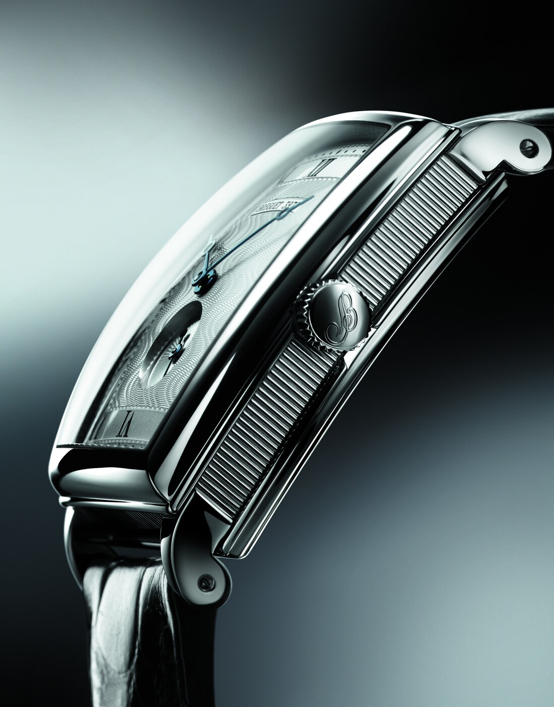 シルバー仕上げゴールドの文字盤の曲線が、2方向に湾曲したケースと呼応します。ギヨシェ装飾の繊細なモチーフは立体感のあるデザインを呈し、それぞれの機能を際立たせて最高の視認性を実現しています。ローマ数字に蓄光塗料を施した大型のインデックスを擁するアワーチャプターが、ミニッツサークルを囲んでいます。6時位置にはスモールセコンドが配置されています。