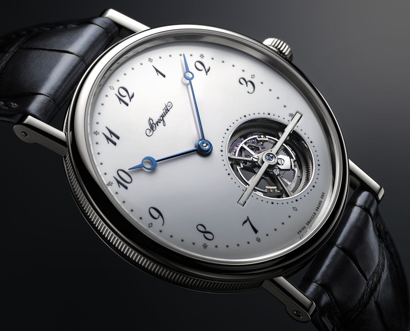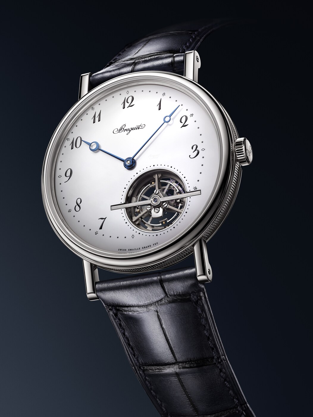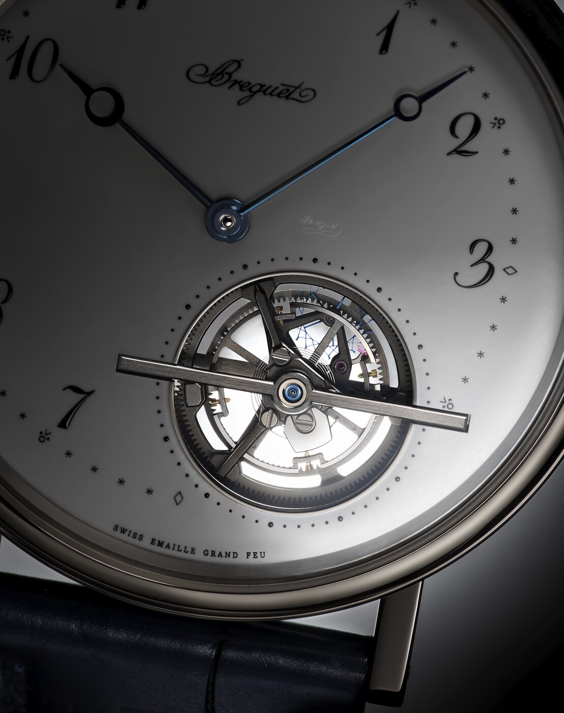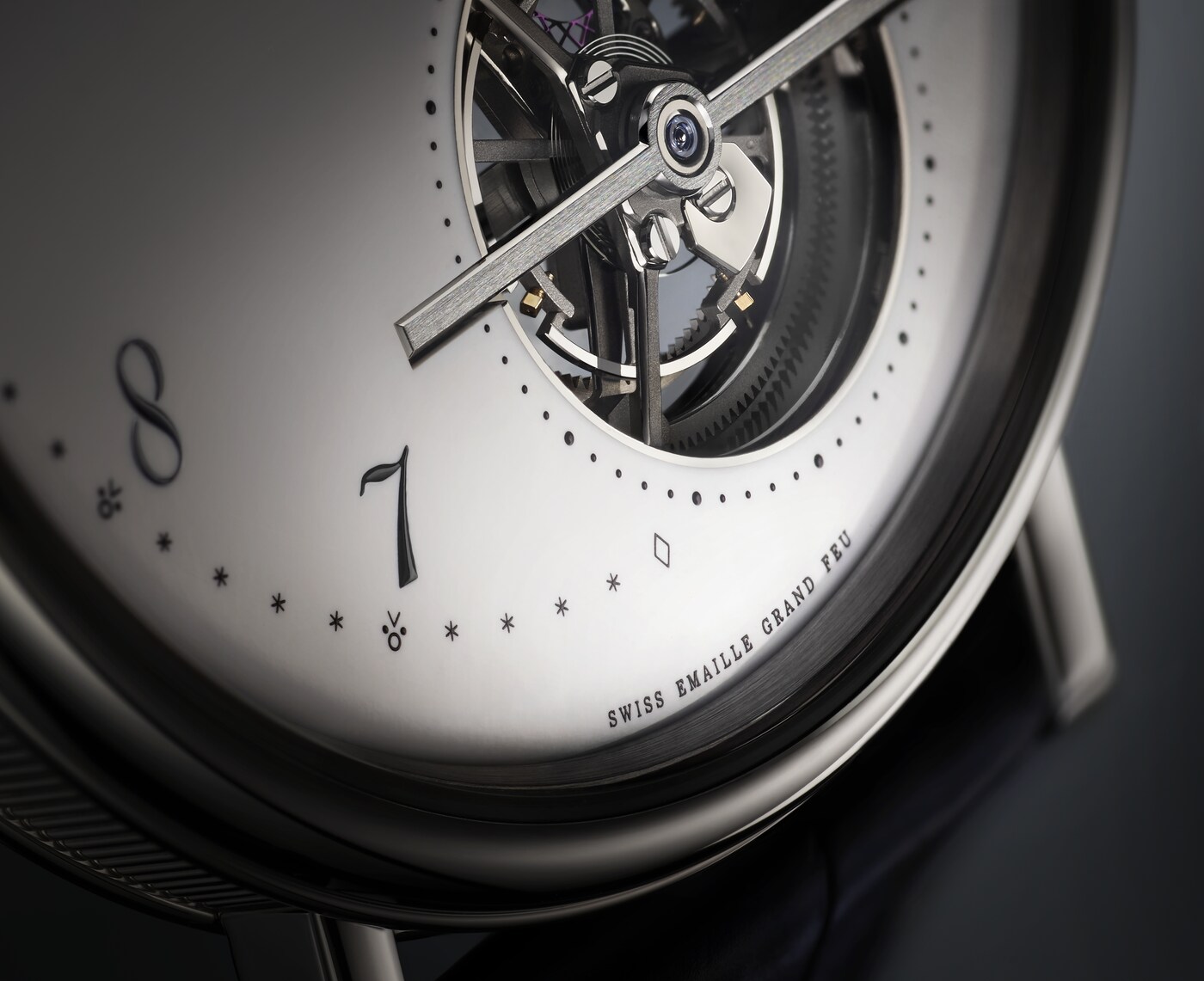 시계에 표시되는 정보는 핵심 요소인 투르비용을 강조하기 위해 필수적인 요소로 축소되었습니다. 브레게의 시각적인 투르비용 바는 수작업으로 각을 살리고 스피넬을 장식했습니다. 또한, 블루 컬러의 브레게 핸즈는 에나멜의 전통적인 화이트 컬러와 대조를 이루며 시간과 분의 완벽한 가독성을 보장합니다. 브레게 아라비아 숫자 아워 챕터는 5시 방향에 위치한 투르비용과 달리, 중심을 벗어나 11시 방향에 자리합니다. 이러한 정보 표시는 당시 관습적인 시계 디자인에 혁명을 일으켰던 브레게의 포켓 워치를 연상시킵니다.