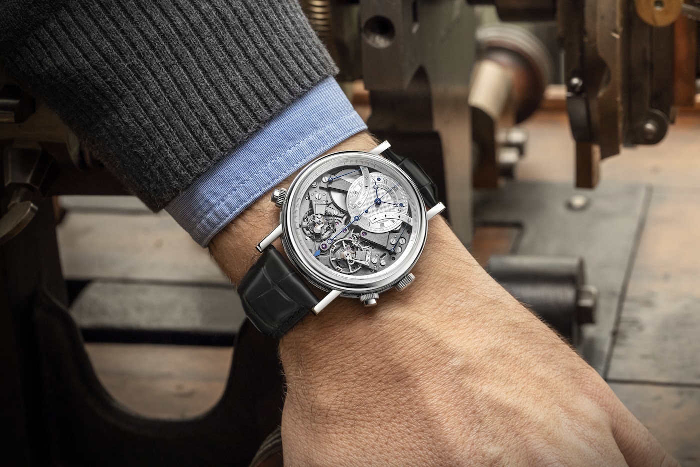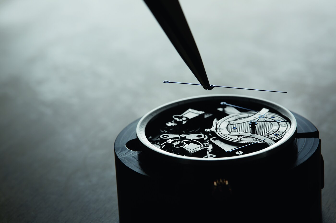 짧은 시간을 측정하면 요청된 기능을 즉각적으로 확인할 수 있지만, 크로노그래프를 작동시키면 메인 기어 트레인이 방해받을 수 있기 때문에 이를 구현하는 것은 여전히 기계적 문제로 남게 됩니다. 두 개의 별도 기어 트레인을 설치하면 이 문제를 해결할 수 있으며 다양한 디스플레이에 뛰어난 정밀도를 제공할 수 있습니다. 미학적 측면에서 트래디션 7077은 규칙을 벗어나지 않는 탁월한 대칭성을 추구합니다. 크로노그래프를 시작하는 인디케이터는 6시 방향에 자리합니다. 2시와 10시 방향에 위치한 레트로그레이드 핸즈는 각각 파워 리저브와 크로노그래프 미닛 카운터를 표시하고, 4시와 8시 방향에서는 두 개의 밸런스 휠이 서로 마주보고 있습니다. 시계 기능에 연결된 휠은 3Hz의 진동수로, 크로노그래프에 연결된 휠은 5Hz의 진동수로 작동하여 정확성을 높였습니다.