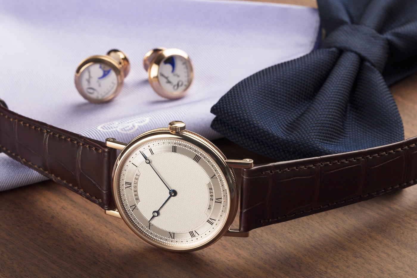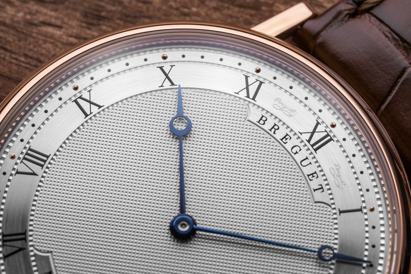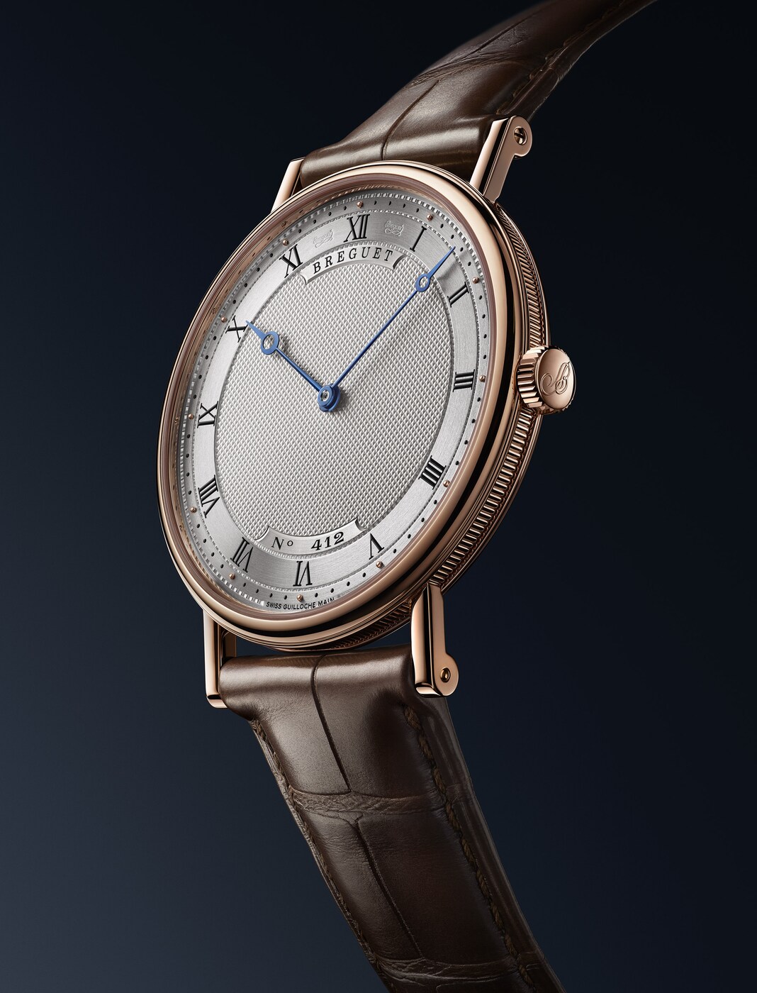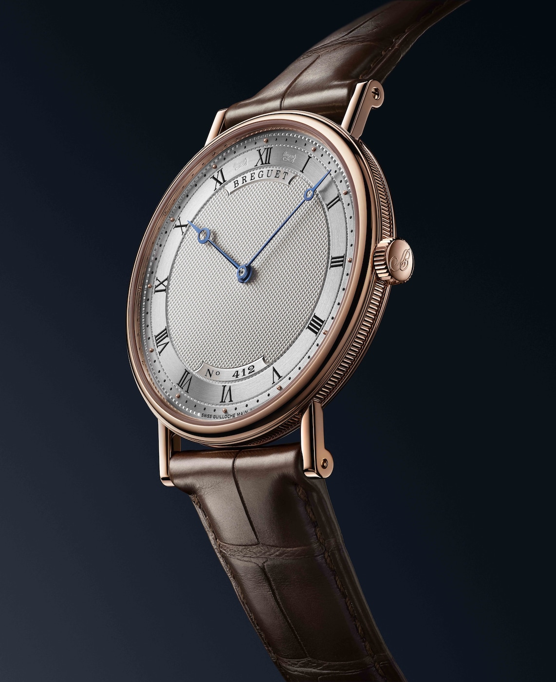 Диаметр этой сверхтонкой модели составляет 38 мм, толщина – 5,5 мм. Непреходящий лаконичный корпус выполнен из золота и оснащен сапфировой задней крышкой. Часы имеют классическую рифленую среднюю часть корпуса и заводную головку с инициалами Бреге. Циферблат с гильоше, выполненным вручную, придает общему облику строгость: диск текущего времени с римскими цифрами, вороненые стрелки с наконечником в форме яблока, индивидуальный номер и секретная подпись между отметками «11 часов» и «12 часов», а также между отметками «12 часов» и «1 час».