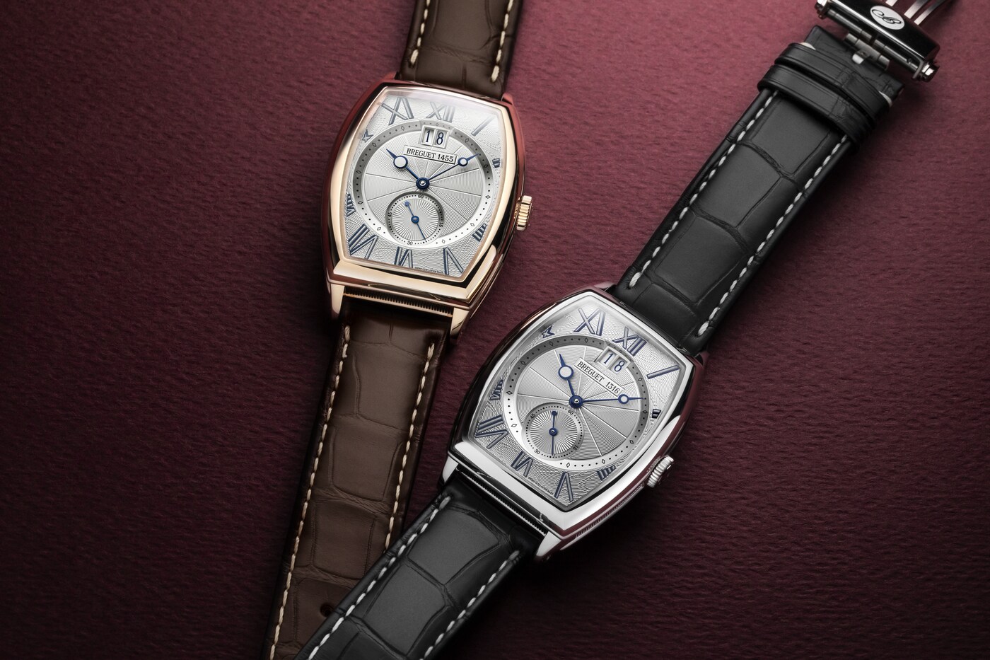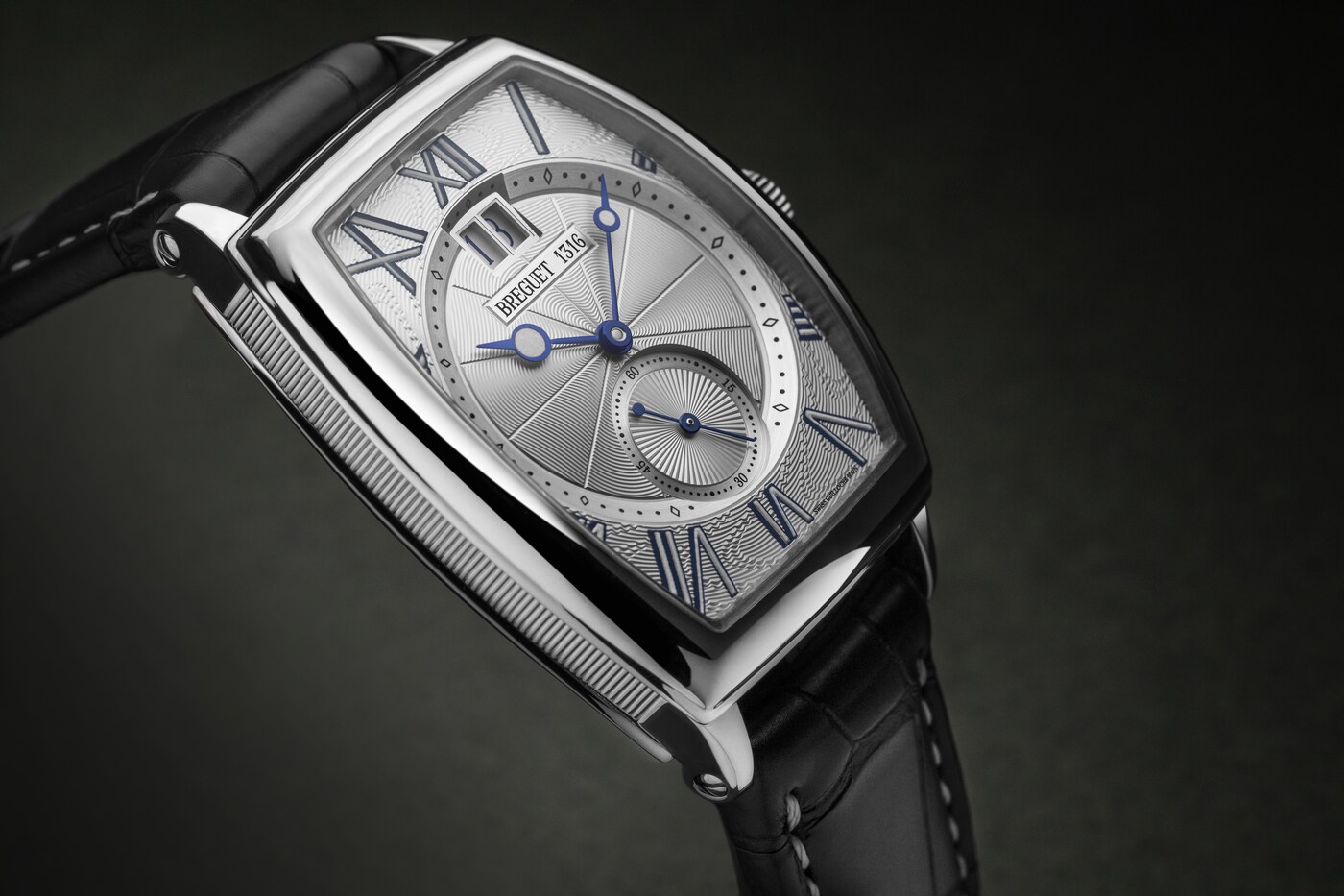 Плавные линии циферблата из посеребренного золота повторяют двойной изгиб корпуса. Изящные гильошированные узоры создают игру структуры и рельефа, подчеркивая и разграничивая различные функции для лучшего считывания их показаний. Часовая шкала с крупными часовыми метками в виде римских цифр, нанесенных методом термопечати и покрытых люминесцентным материалом, обрамляет минутную разметку. Индикацию дополняет малая секундная стрелка в положении «6 часов».