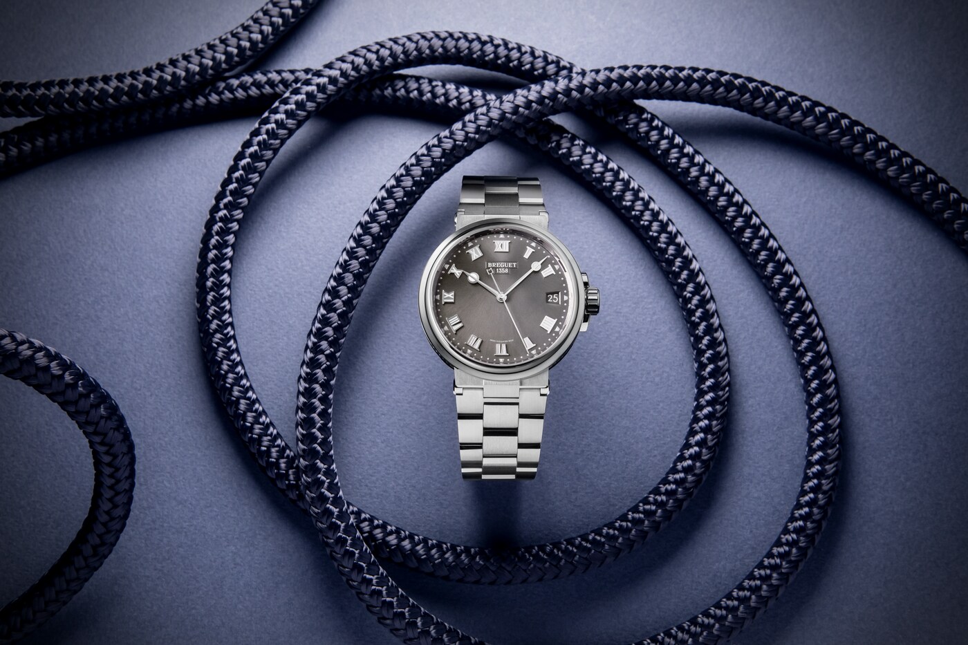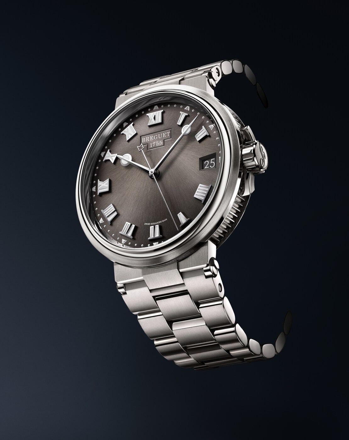 Многие ее детали проникнуты самобытностью коллекции Marine, такие как секундная стрелка, визуально уравновешенная изображением морского флага с инициалами Бреге. Заводная головка этой 40-мм модели окружена волнообразным декором. Задняя крышка из сапфирового стекла открывает взгляду автоматический механизм и ротор, напоминающий руль корабля.