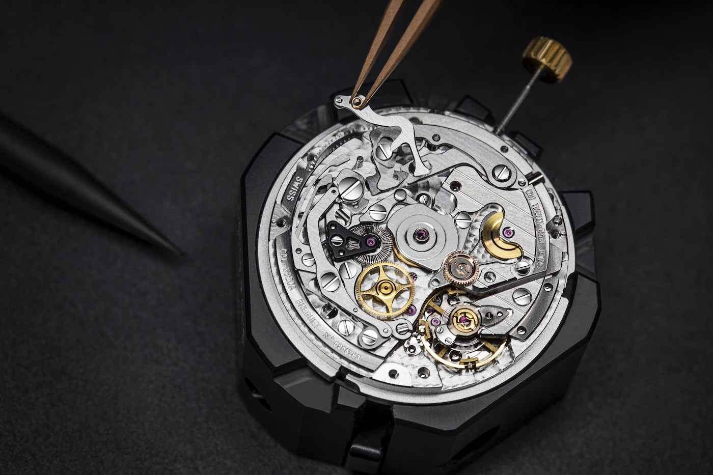 Данная модель с большой центральной стрелкой выделяется наличием сплит-секундной функции хронографа, а также указателя даты между отметками «4 часа» и «5 часов».