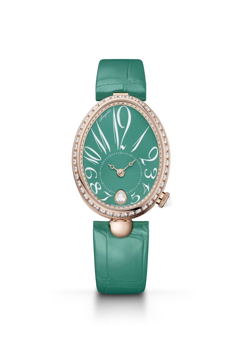 Их дополняют неизменно актуальные стрелки Breguet с наконечником в форме яблока. Еще две детали, в положении «6 часов», задают тон этим часам размером 36,50 х 28,45 мм: камень грушевидной огранки и «ножка» шаровидной формы, соединяющая среднюю часть корпуса с браслетом. Для придания максимального блеска безель, фланец и заводная головка украшены бриллиантами.