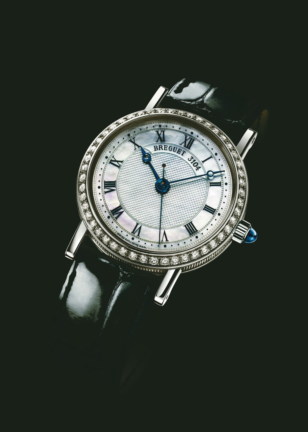 配戴者無需藉助任何工具,即可透過錶帶更換系統方便地自行更換錶帶。除豐富考究的細節之外,錶冠還鑲嵌一顆凸圓形鑽石。錶殼上的錶圈和錶耳共鑲嵌64顆明亮式切割鑽石。珍珠母貝錶盤飾有精美的機刻雕花圖案,並搭配帶寶璣阿拉伯數字的小時圈。