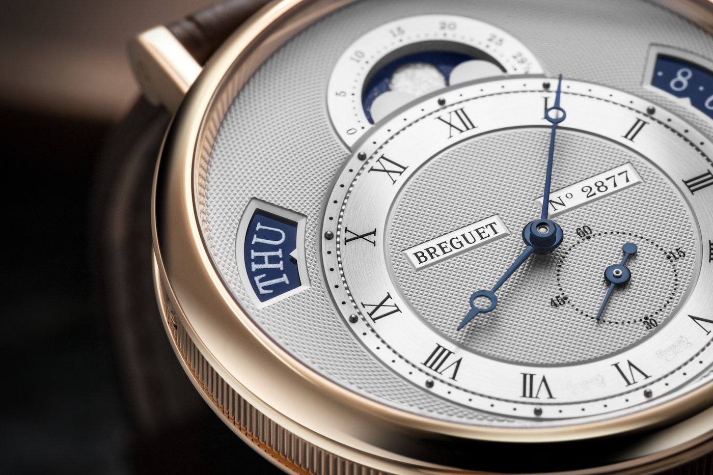 偏心小時圈位於錶盤下方,搭配經典的鏤空「月形」寶璣指針。其上方設有月相顯示,一枚手工捶製金質立體圓盤代表月亮,在漆面夜空中閃耀光芒。