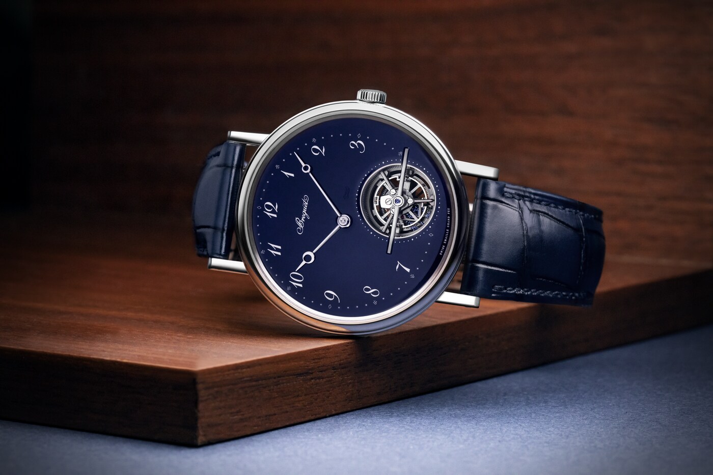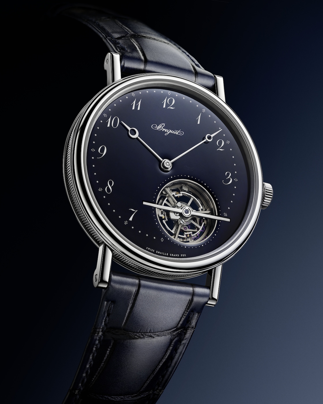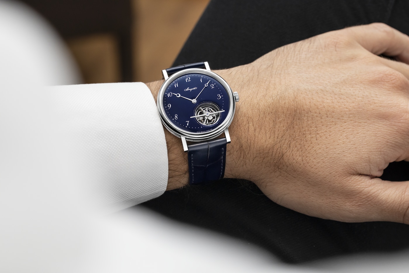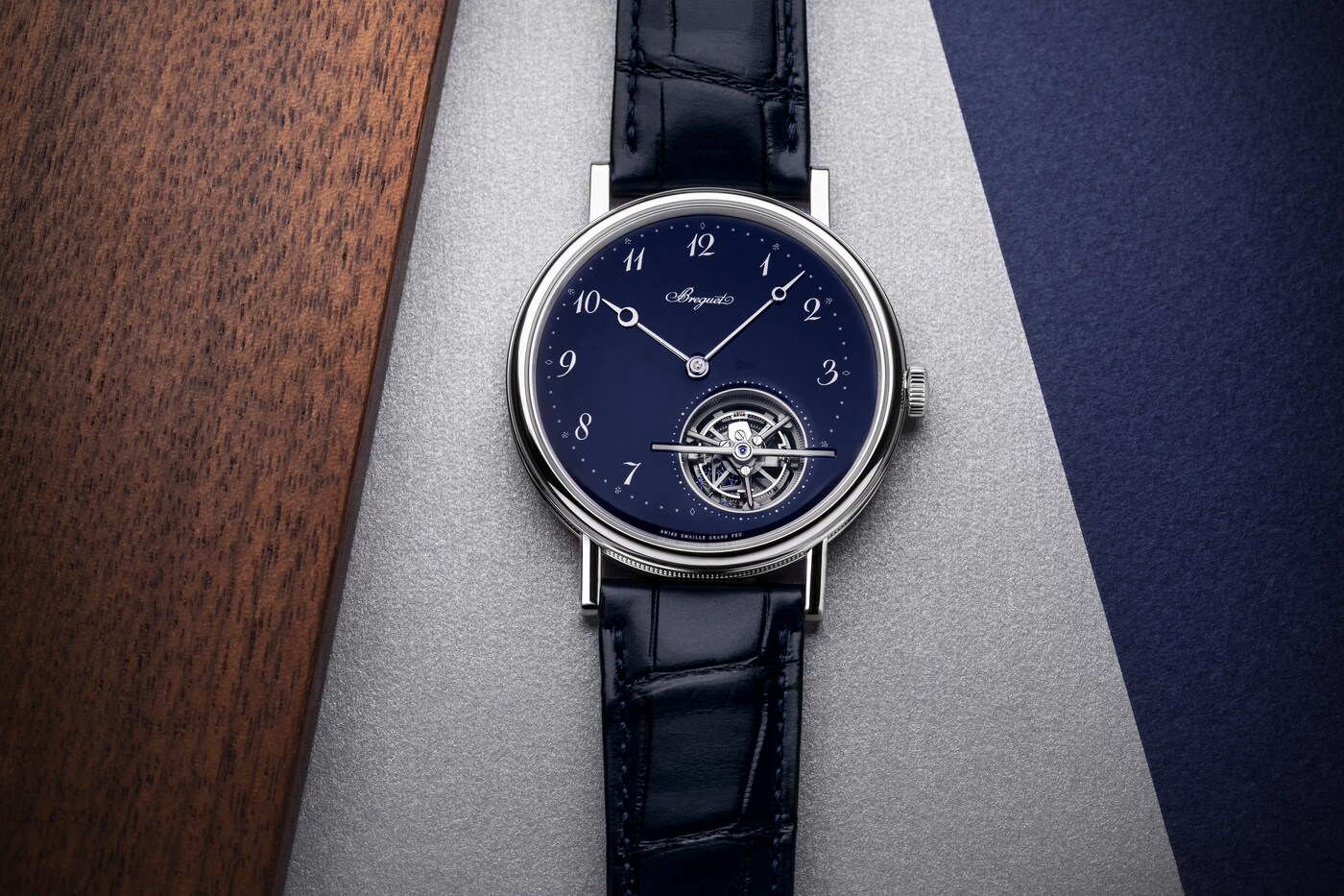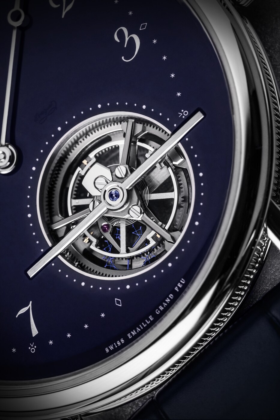 寶璣在這款腕錶上僅保留基本元素,從而將視線引向點睛之筆——陀飛輪。風格醒目的陀飛輪桿經過手工倒角處理,並鑲嵌一顆尖晶石。藍色寶璣指針與白色的傳統琺瑯形成鮮明對比,令時分顯示清晰易讀。寶璣阿拉伯數字偏心小時圈偏向11時位置,陀飛輪則位於5時位置。這種佈局不禁讓人聯想到阿伯拉罕-路易.寶璣(Abraham-Louis Breguet)先生製作的懷錶,他大膽顛覆了當時製錶領域的美學規則。