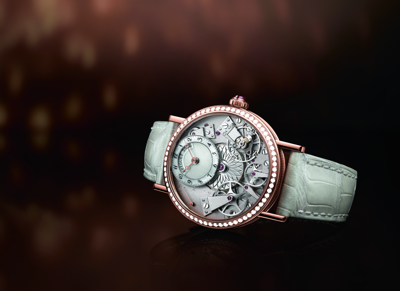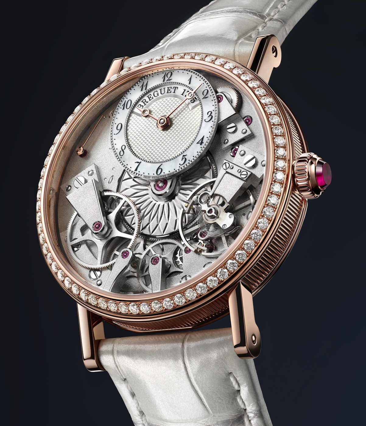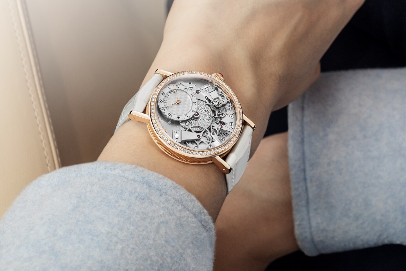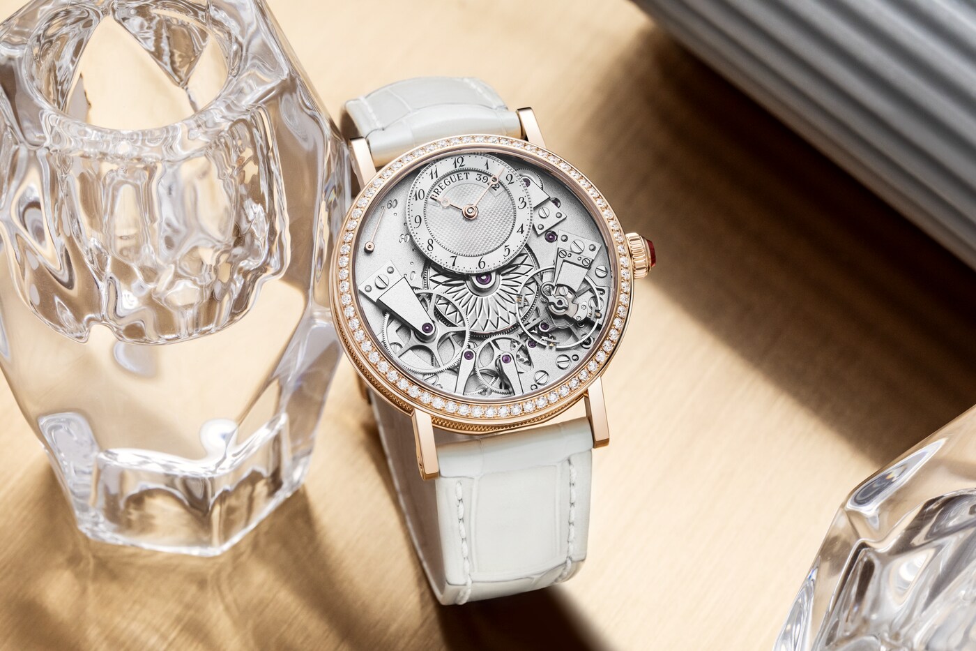 在這款腕錶中,寶璣巧妙融入精緻的珠寶工藝與細膩溫潤的珍珠母貝。